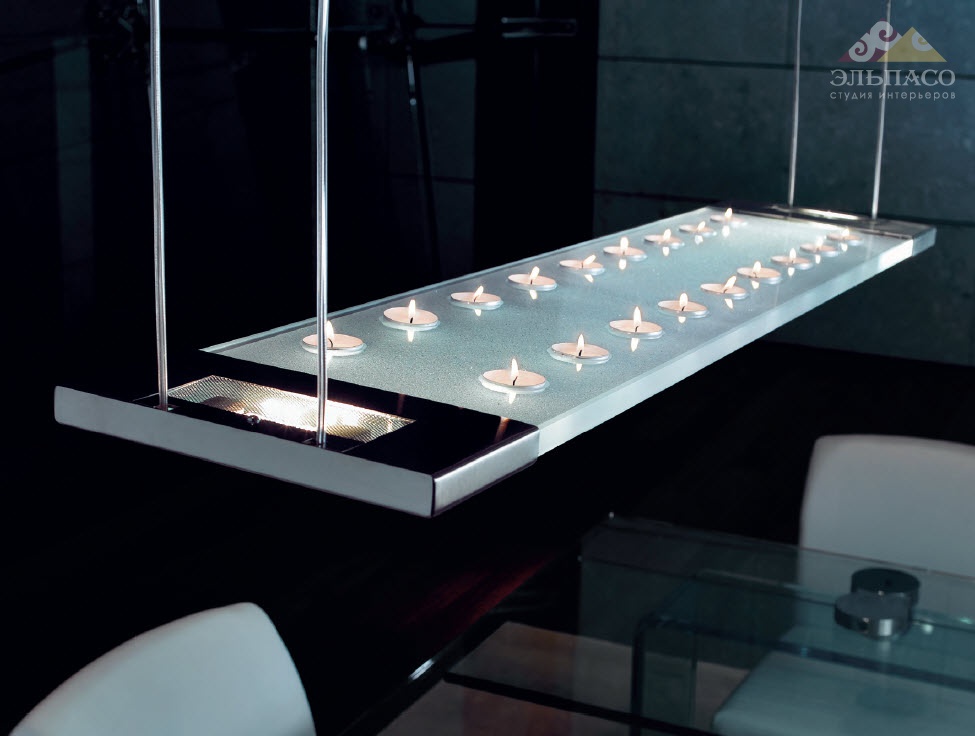 Высота:200 смДизайнерская подвесная лампа. Необычная секция из прозрачного "как бы битого" стекла толщиной 19 мм с многочисленными отверстиями для свечей изящно дополняет дизайн. Обрамление из отшлифованной нержавеющей стали. Прямоугольная пластина крепления к потолку изготовлена из белого лакированного стекла. Светодиодная система освещения оборудована галогенными лампами 100 Вт.