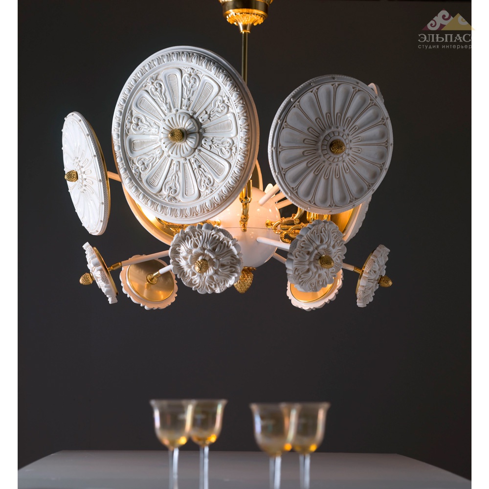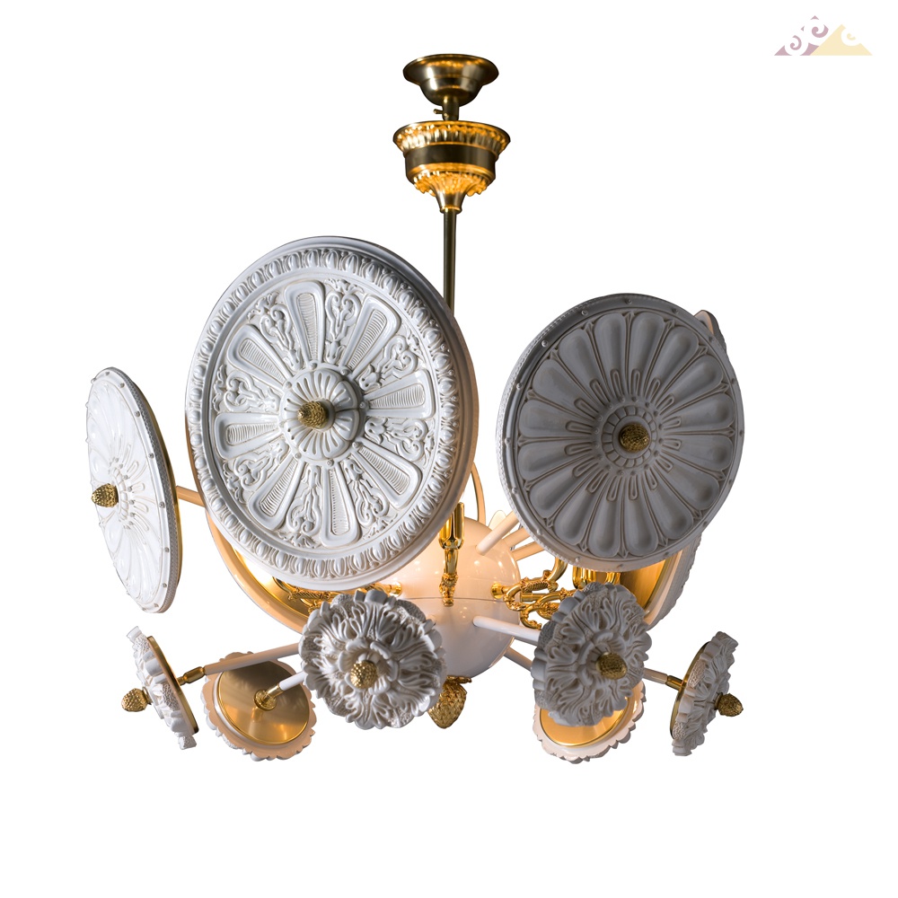 Люстра с латунным основанием, золотого цвета. Круглый декор из майолики. 9xE14 40W Вес: 34 кг