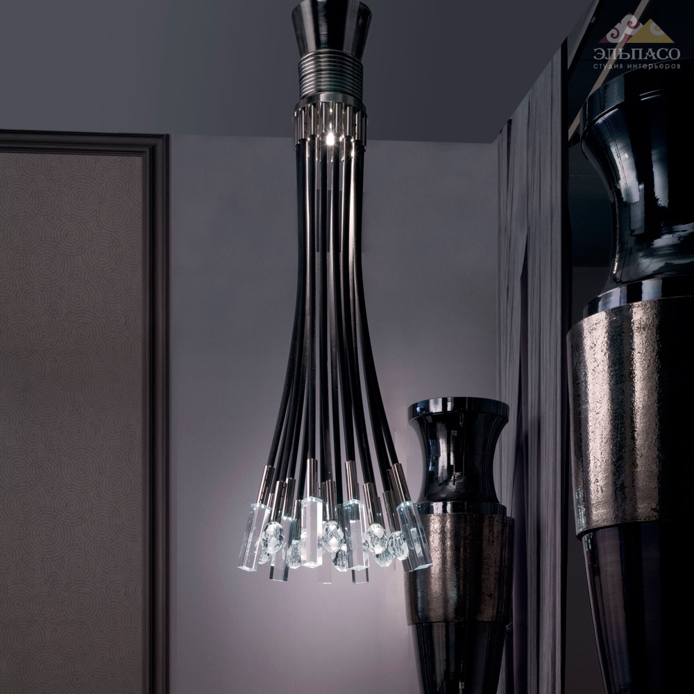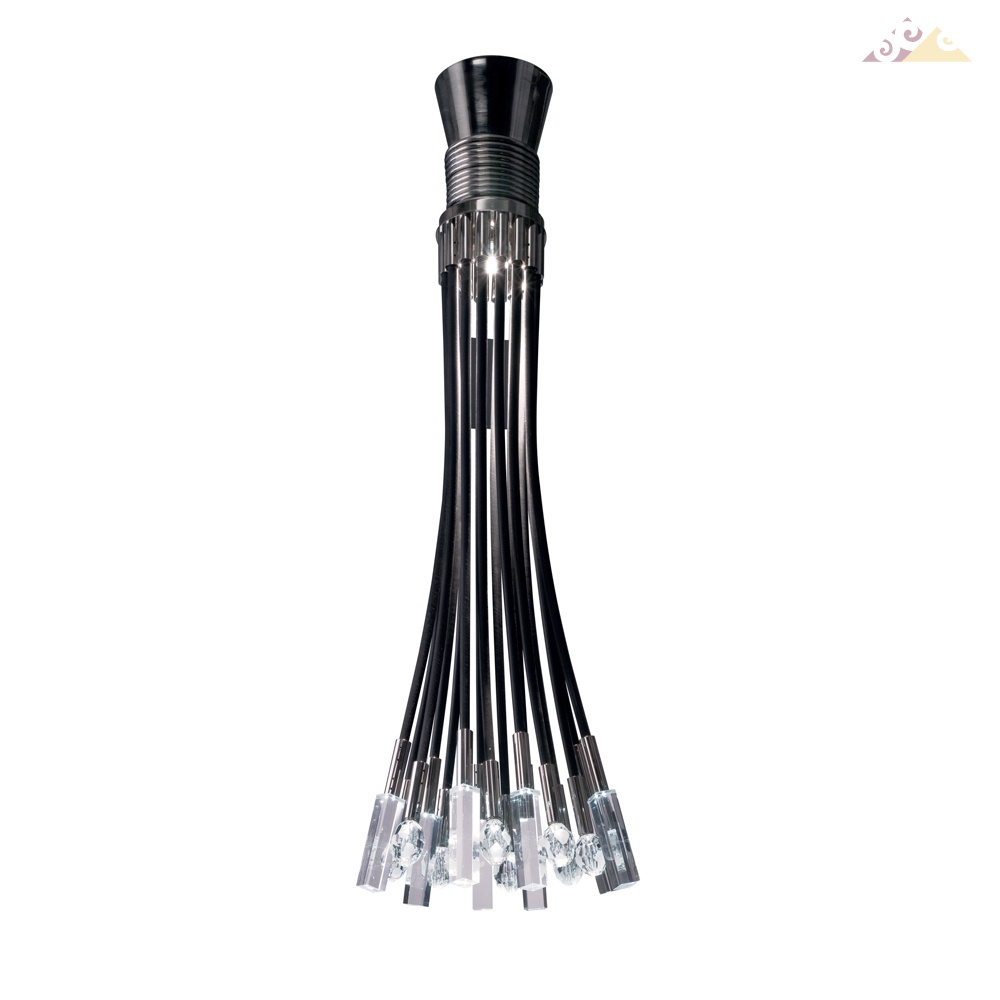 Подвесной светильник с хромированной латунной структурой. Черные каучуковые трубки. Освещение в верхней части, GU10-50W. Кристаллы сделаны ручной работай из оргстекло, светодиодная яркая система. 16x0,25W 12V-45 ° -K6500. Вес: 33 кг