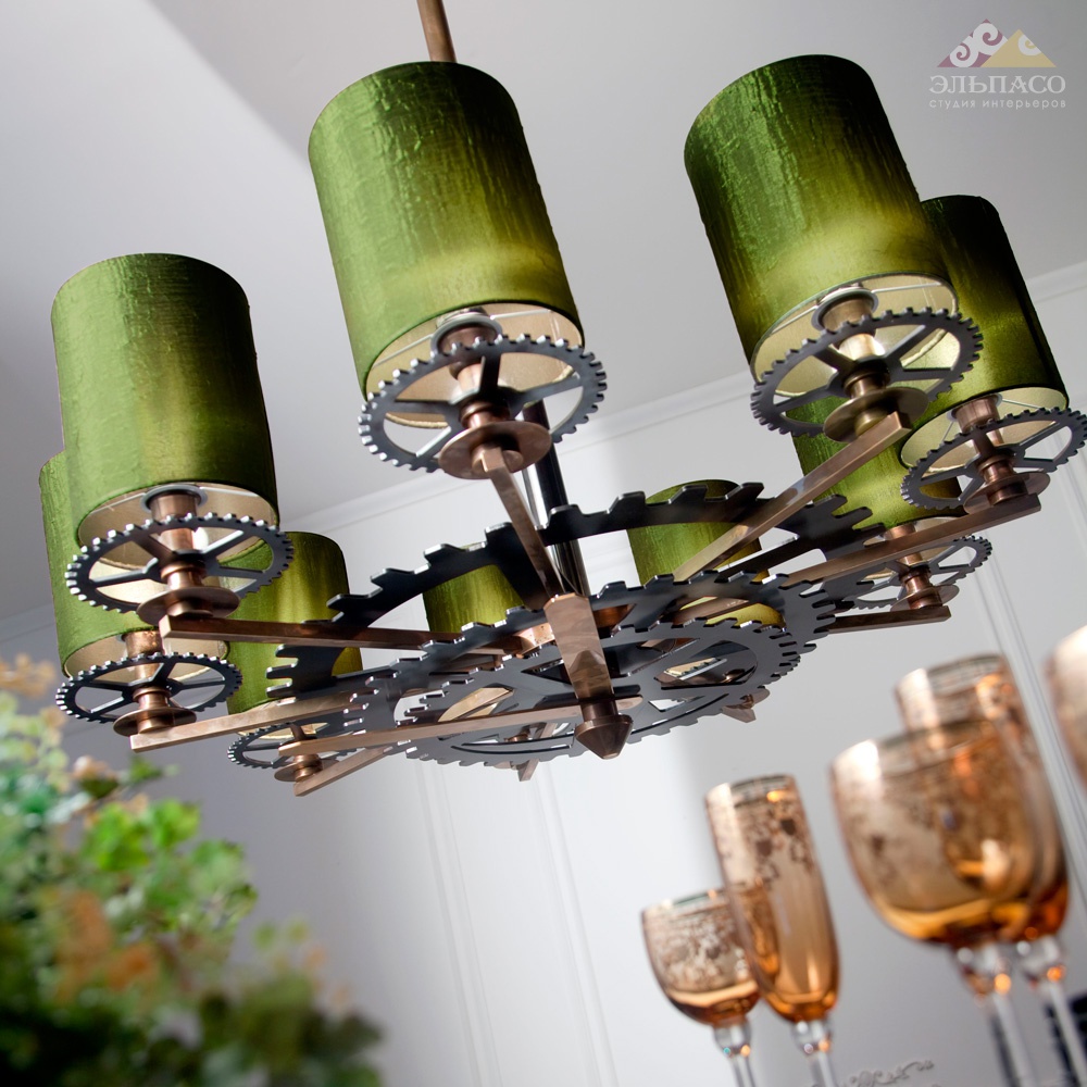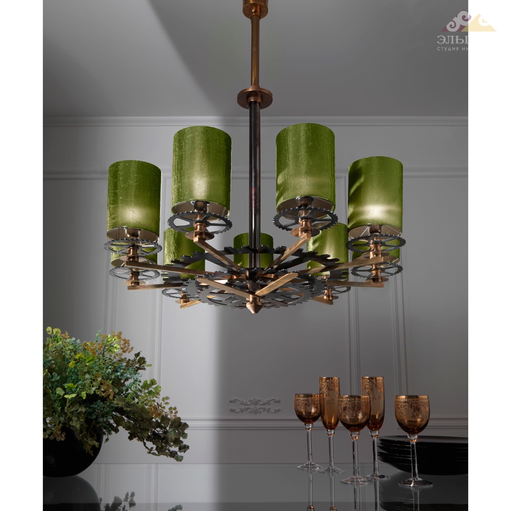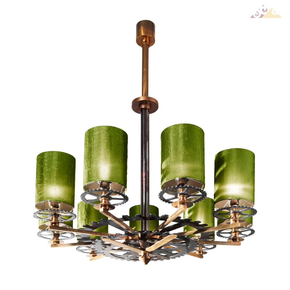 Люстра в полированной бронзовой отделке с шестеренками. Девять шелковых зеленых абажуров. 9xE27 60W Вес: 34 кг