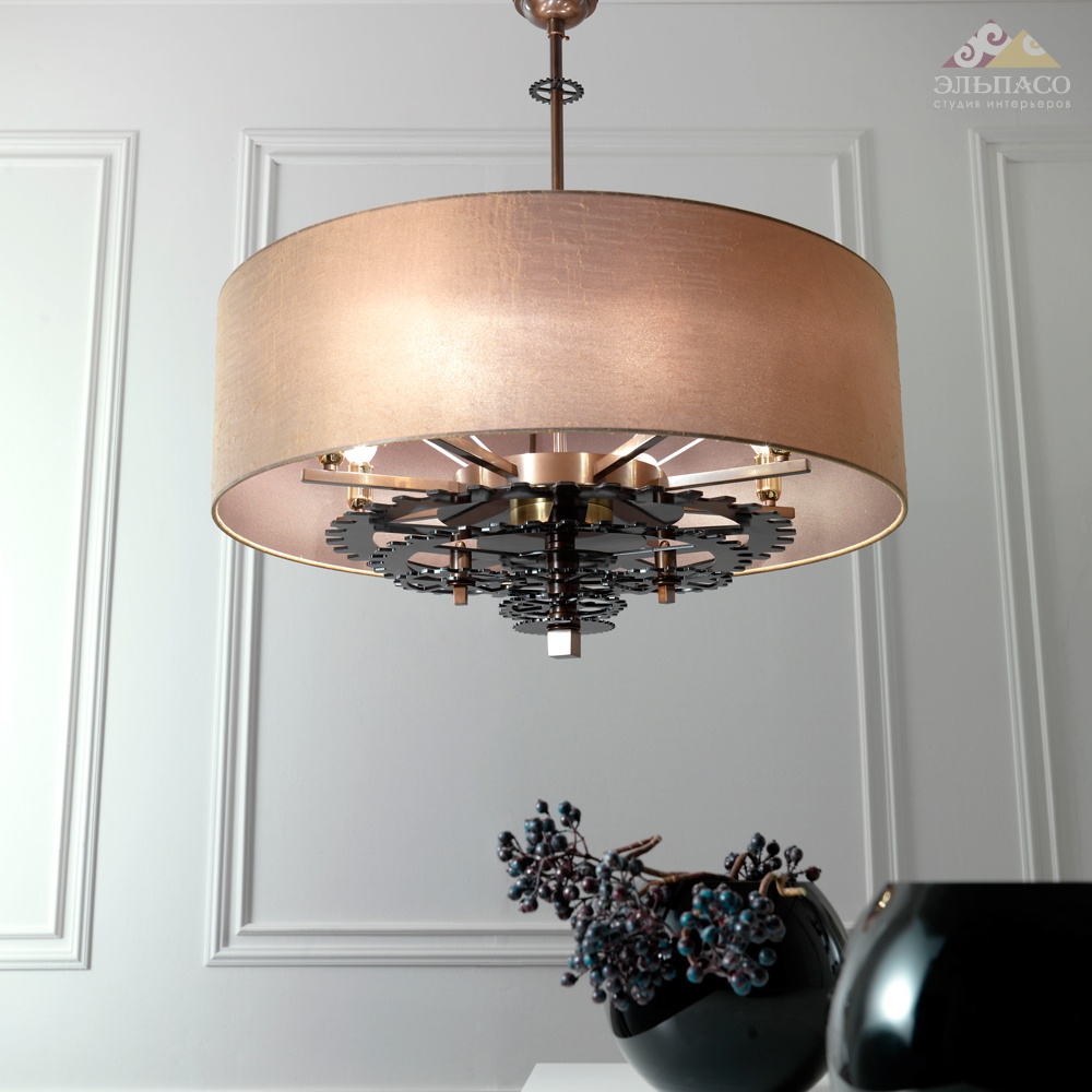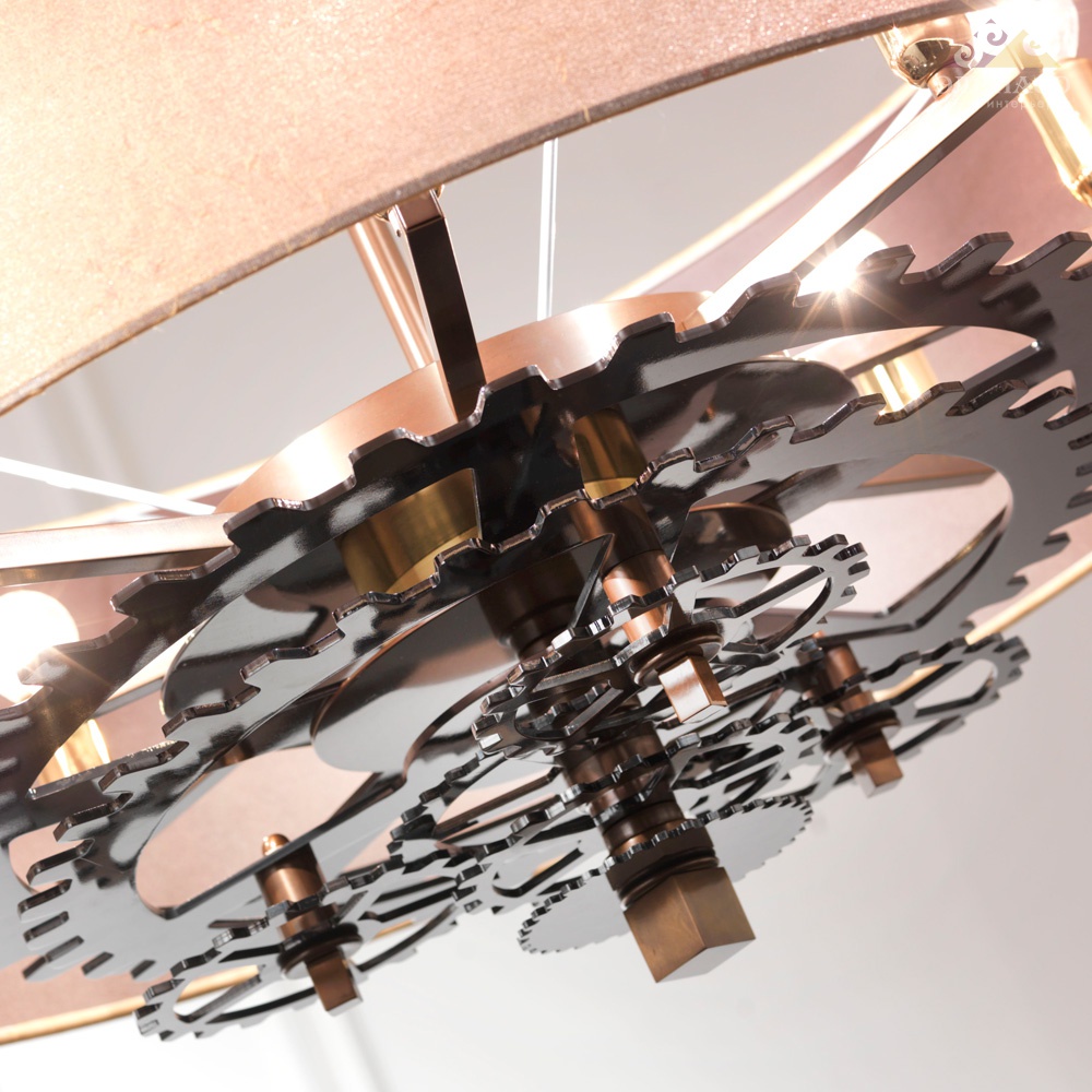 Люстра из полированного железа с черными шестеренками. Шелковый абажур. 8xE14 60W Вес: 18 кг