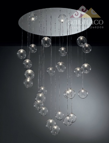 Высота:130 смДизайнерская люстра с 25-ю сферами из прозрачного или цветного стекла. Стеклянное потолочное крепление - отполированное зеркальное. Возможно лакированное исполнение крепления в белом или чёрном цвете. Выдувные стеклянные сферы могут иметь гладкую поверхность или “à torchon”. Люстра укомплектована галогенными лампами внутри сфер или светодиодами.