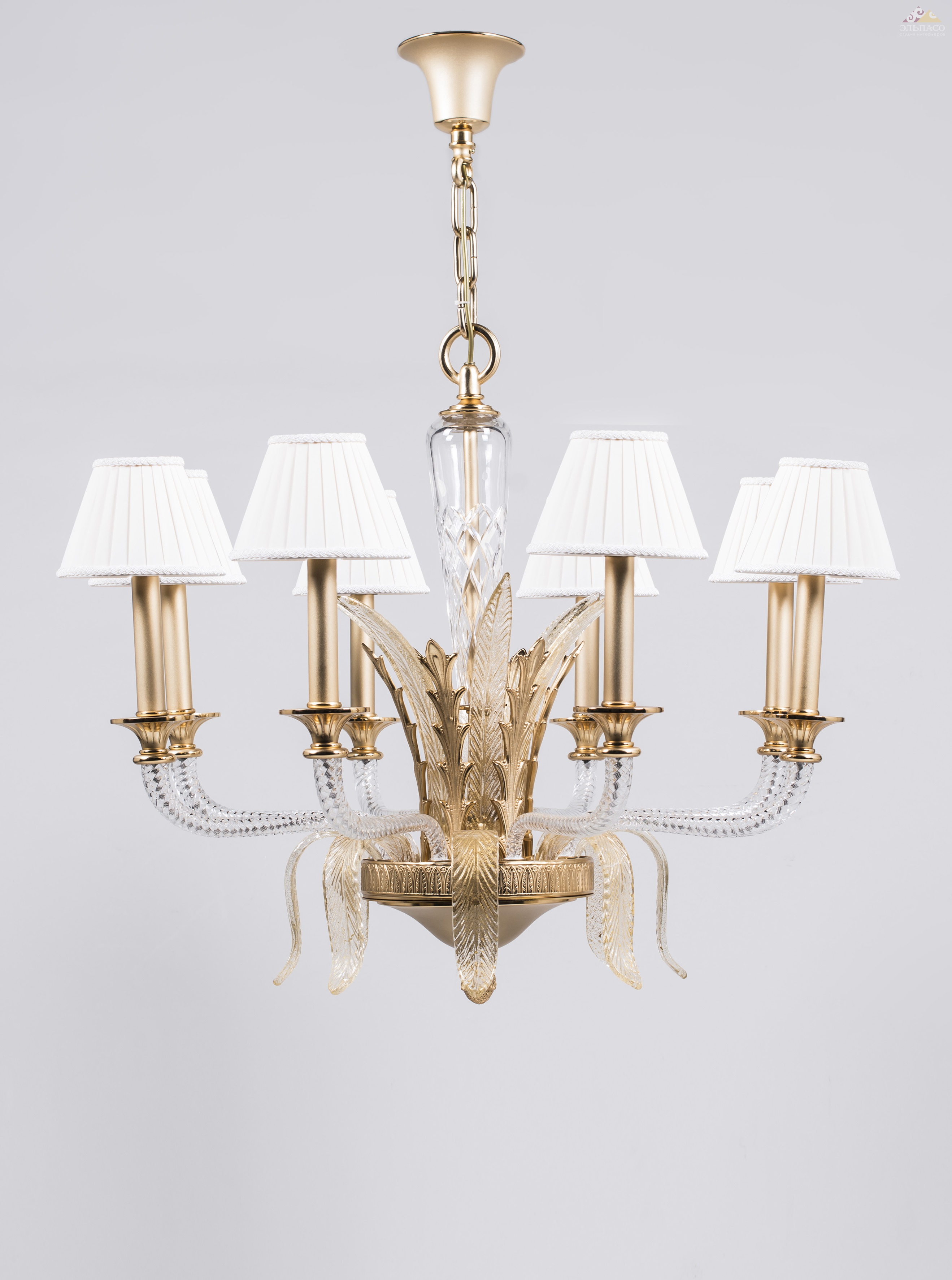 Стильная люстра Mariner Аrt.20070.1 на восемь лампочек стандарта Е14. Корпус модели изготовлен из литой бронзы и резного хрусталя. Поверхности полированы вручную, украшены классическими орнаментами и деталями из венецианского стекла. Элементы декора покрыты тонким слоем античного золота. Каждая лампочка прикрыта отдельным абажуром белого цвета, отделанным плиссировкой. Роскошь, исключительность, престиж.