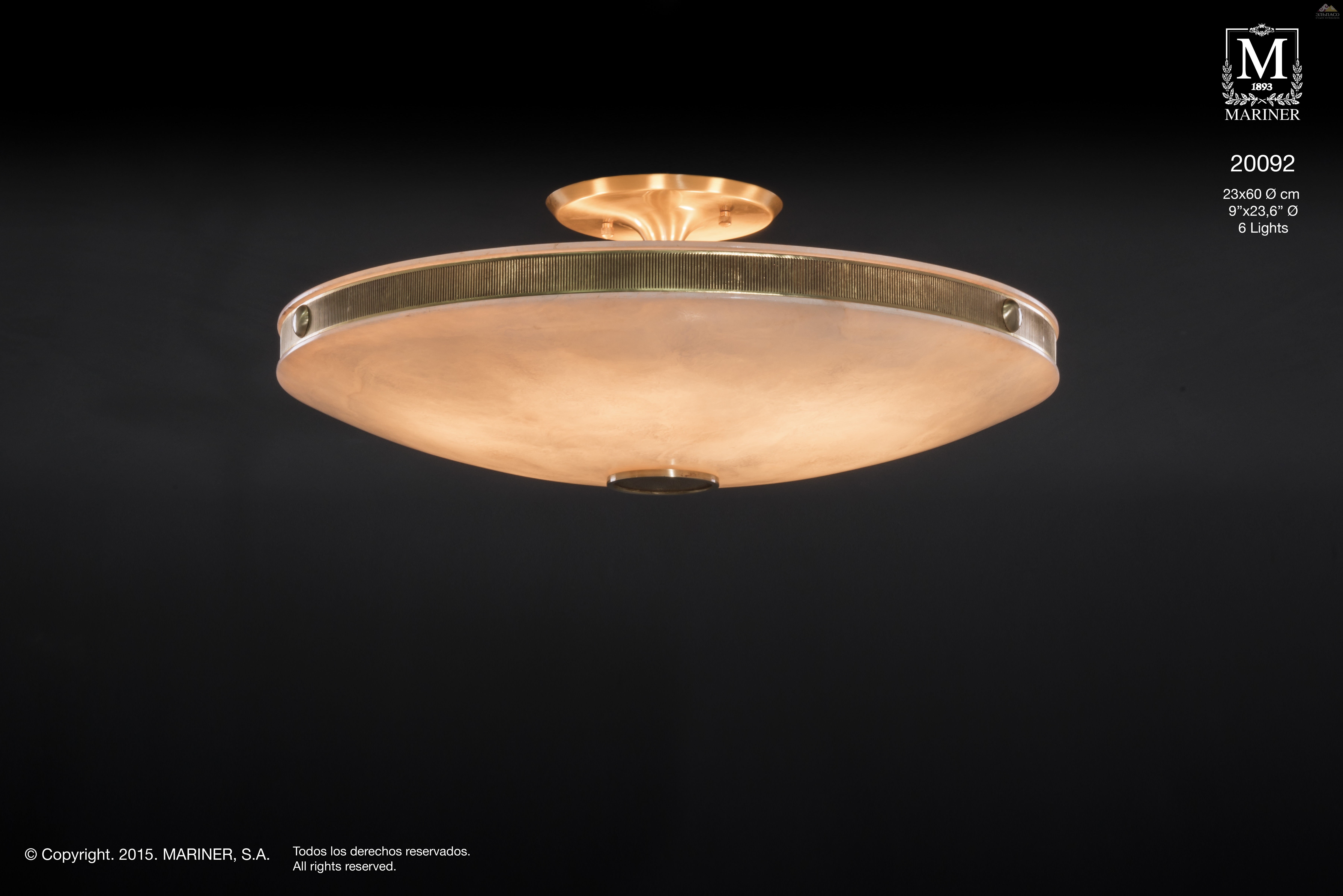 Изящная люстра Mariner Аrt.20092 в виде плафона потолочной конструкции, на шесть лампочек стандарта Е14. Корпус модели изготовлен из литой бронзы. Поверхности полированы вручную. Элементы декора покрыты тонким слоем французского золота. Абажур люстры выполнен из белого гипса. Роскошь, исключительность, престиж.