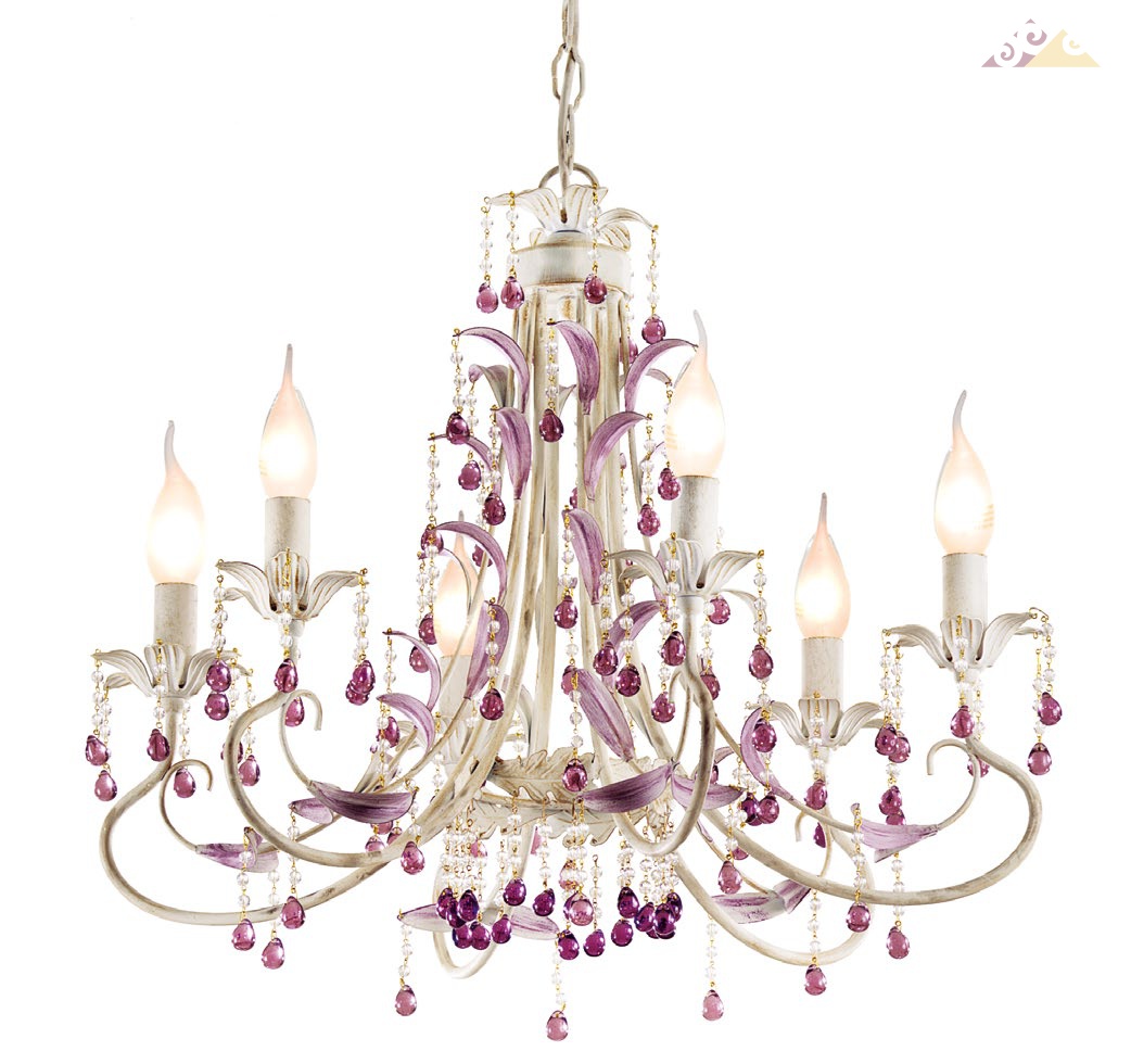 Роскошная модель люстры для зала, гостиной комнаты и других помещений. Основание люстры изготовлено из стали ручной ковки цвета слоновой кости с эффектом искусственной старины с патиной лилового цвета. Элементы декора люстры в виде подвесок аметистового цвета и гирлянд из хрустального жемчуга, изготовлены из богемского хрусталя. Стиль и роскошь.