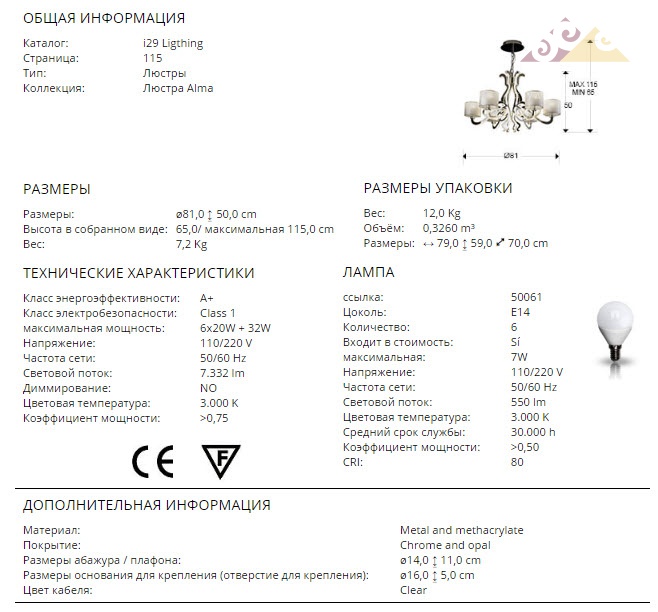 Высота:50 смЛюстра SCHULLER ALMA Art.780437 из металла с покрытием "хром" и метакрилата опалового цвета со светодиодной подсветкой. Раздельное включение абажуров, центральной части или всей люстры при помощи настенного включателя, 6 E14 + 1.020 LED общей мощностью 32W.