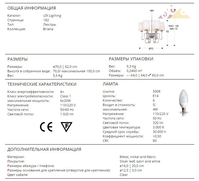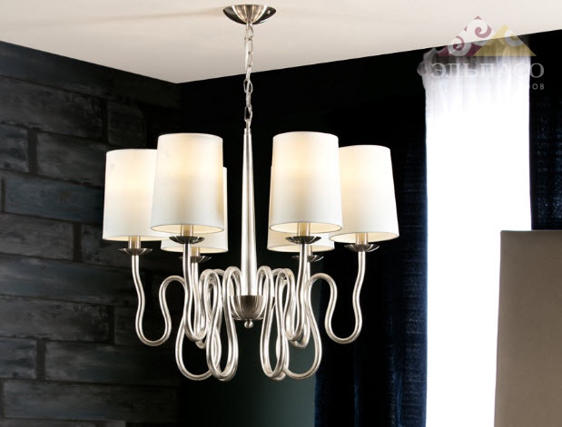 Высота:62 смЛюстра SCHULLER BRIANA Art.513646 с 6 лампами из металла с покрытием "серебряная фольга" и "сатинированный никель". Абажуры из белой ткани.