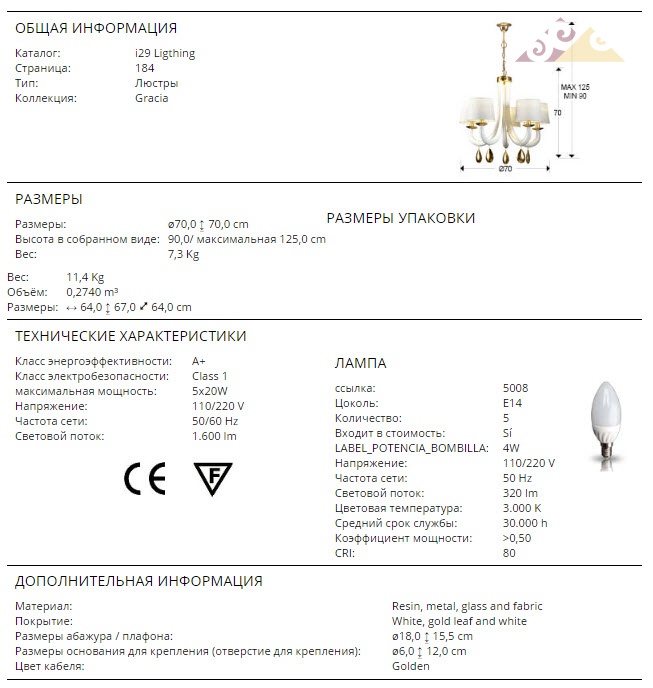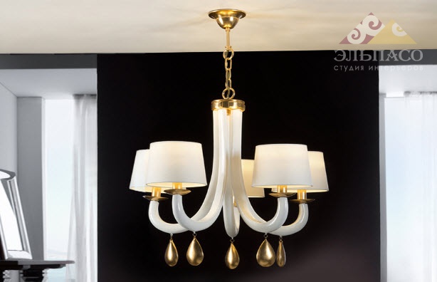 Высота:70 смЛюстра SCHULLER GRACIA Art.432529 с 5 лампами из синтетической смолы и металла с блестящим белым покрытием, отдельные детали с покрытием из золотой фольги. Подвески из стекла, покрытого золотой фольгой. Абажуры конической формы из белой ткани.