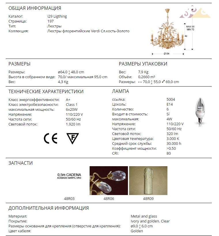 Высота:48 смЛюстра SCHULLER VERDI Art.481016 во флорентийском стиле из металла с 6 лампами, покрытие из серебряной фольги с белой патиной, украшения из гранёного стекла, 6 E14 макс. 60w.