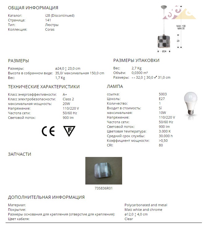 Высота:23 смПодвесной светильник SCHULLER CORAS Art.735648 с плафоном, образованным пластинами из поликарбоната с рифлёной поверхностью. Каркас из металла с серовато-белым матовым покрытием и покрытием "хром". Нижний рассеиватель, 1 E27 LED 10W.