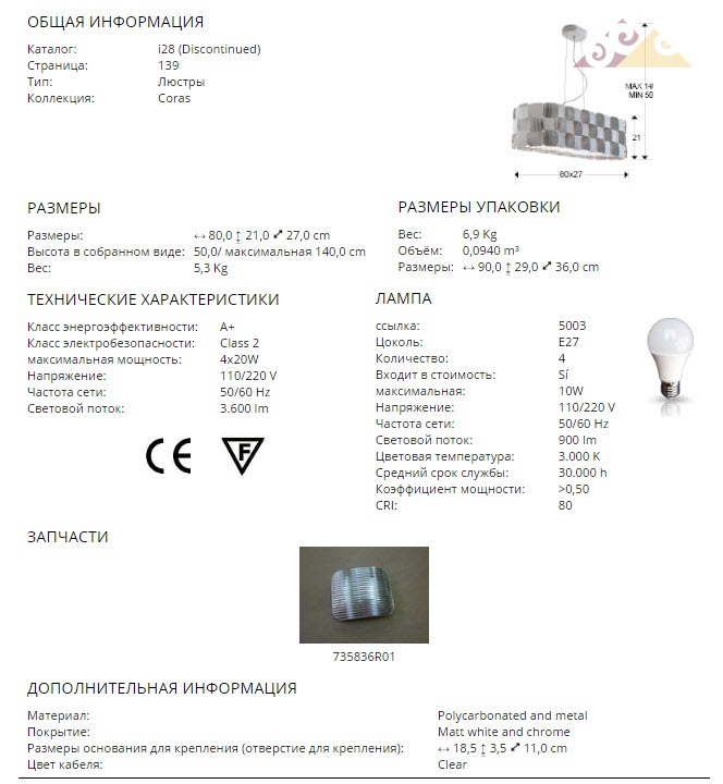 Высота:21 смПодвесной светильник SCHULLER CORAS Art.735779 с овальным плафоном, образованным пластинами из поликарбоната с рифлёной поверхностью. Каркас из металла с серовато-белым матовым покрытием и покрытием "хром". Нижний рассеиватель, 4 E27 LED 10W.
