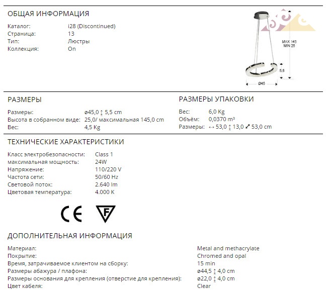 Высота:5.5 смПодвесной светодиодный светильник SCHULLER ON Art.562671 из металла с покрытием "блестящий хром", с рассеивателем из матированного метакрилата, со скрытым освещением, светодиодная лента 240 LED x 0,1w. 2640 Lm.