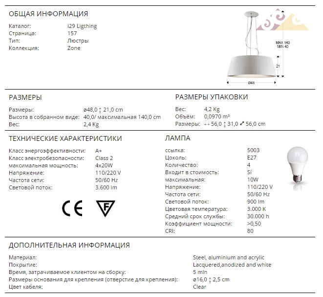 Высота:21 смНебольшой подвесной светильник SCHULLER ZONE Art.198321 из лакированной стали, плафон из анодированного алюминия с матовой отделкой цвета "талый лёд", с формованным акриловым рассеивателем. 4 E27 LED 10W