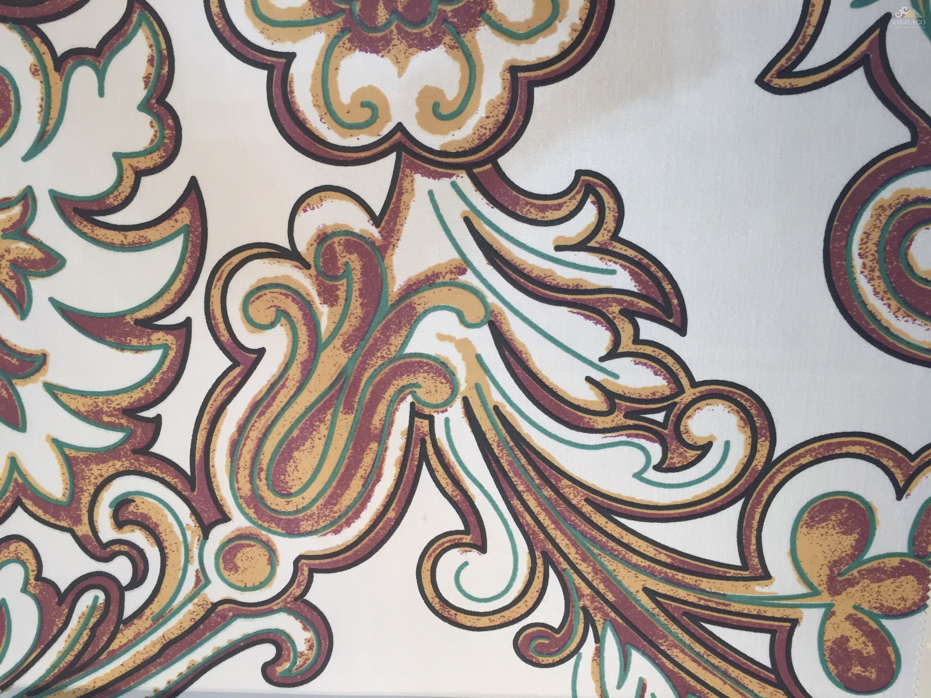 Неоклассический дизайн со стилизованными розеттами и барочными завитками, напечатанными на сатиновой основе и органзе, в ярких сочных цветах, с акварельным эффектом и четкими контурами. В коллекции имеются ткани компаньоны.