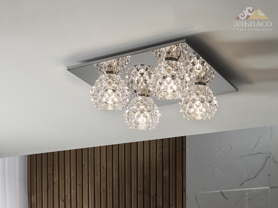 Модная потолочная люстра Schuller Hestia II с 4 лампами, основание из металла с покрытием "хром", плафоны из прессованного прозрачного стекла. Стилистика под пчелиные соты, с углублениями стекла даёт красивый эффект рассеивания света. Самые актуальные светильники и предметы напрямую от фабрики Schuller в компании Elpaso.