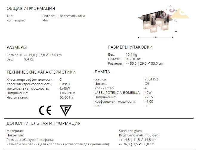 Высота:23 смПотолочный светильник Schuller Flor Art.742810 с лампой из блестящего металла, плафон из матированного формованного стекла, 1 G9 40W.