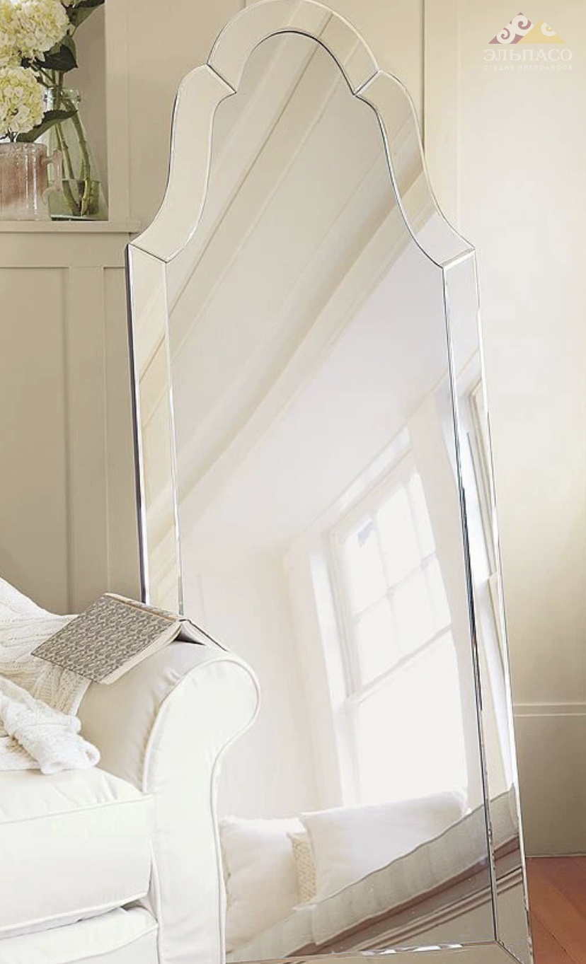 Благодаря необычной фигурной раме, напольное зеркало напоминает изысканные предметы интерьера викторианской эпохи. В нижней части широкая рамка выполнена в виде правильного прямоугольника, верх зеркала приобретает красивые волнообразные формы, преображаясь в аккуратный зауженный овал. Рама подчеркнута полированной зеркальной фактурой повторяющий в точности все плавные изгибы, что придает ей визуальной легкости и невесомости. Это зеркало в полный рост оснащено двумя креплениями для размещения на стене в портретной ориентации.