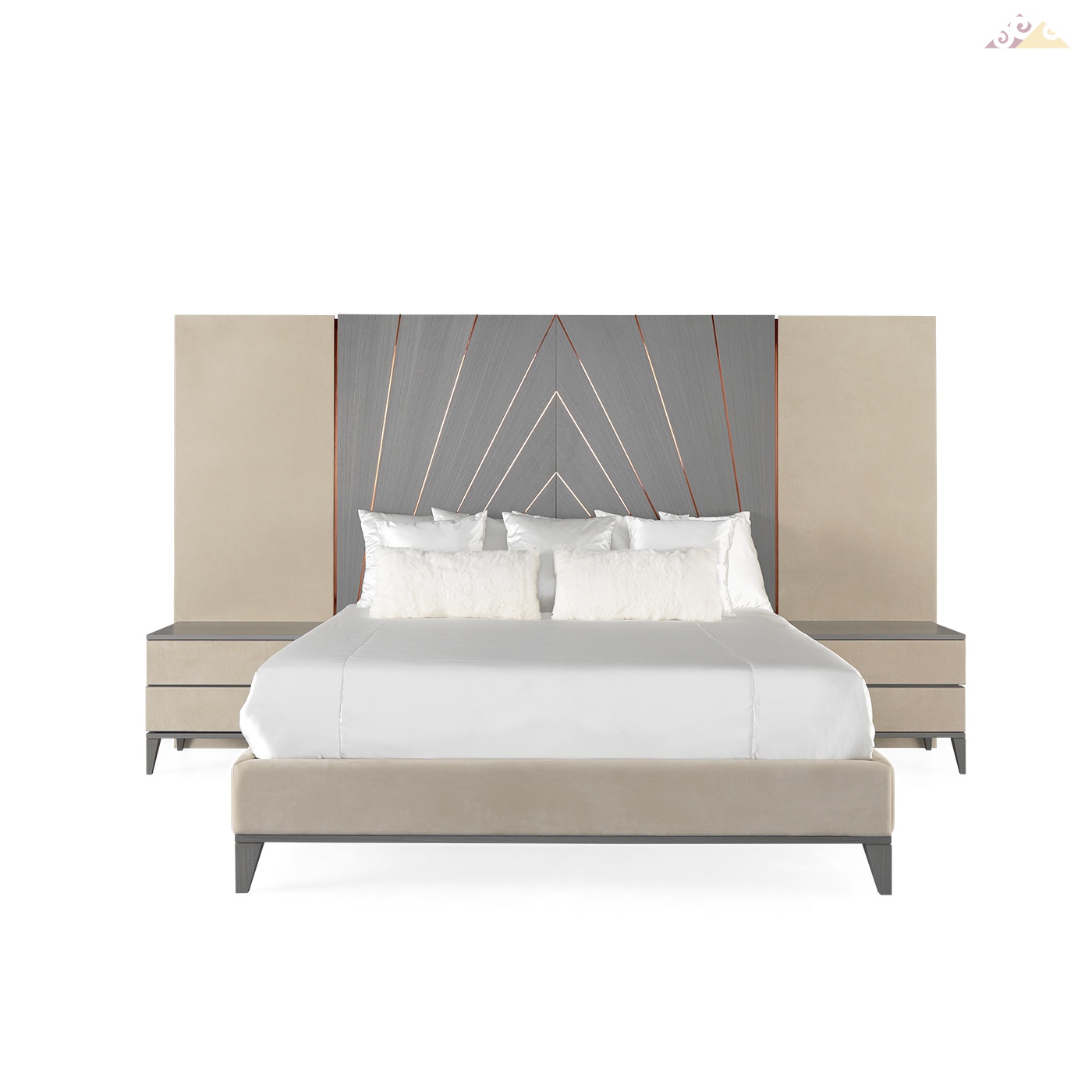 Деревянная кровать AMY с широким изголовьем. Декор кровати сочетает в себе серый и бежевый цвет, с металлическими линиями - медного цвета. Размер матраса (160*200). Тумбочки в цену не входят. Кровать можно заказать в других размерах и цветах.