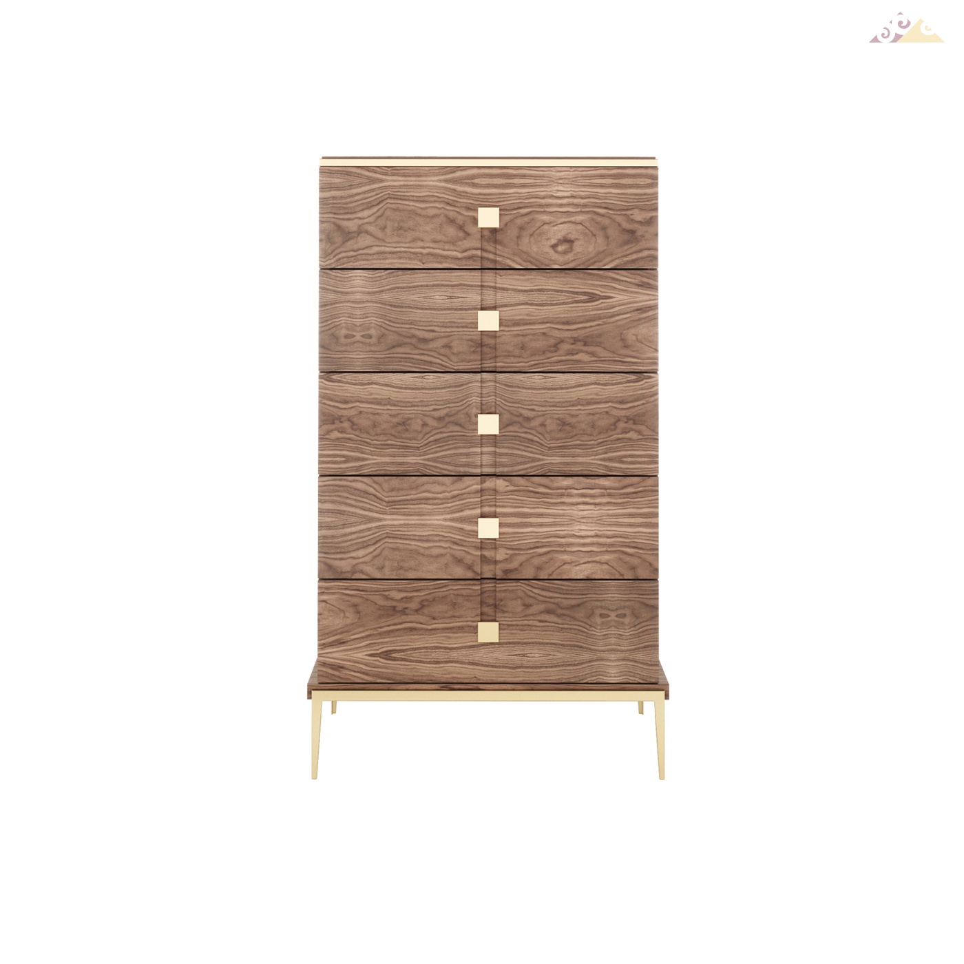 Высокий комод в спальню, с пятью выдвижными ящиками. Основание комода из дерева цвета орех, ножки и ручки из нержавеющей стали - золотого цвета. Доступен к заказу в других цветах шпона и металла.