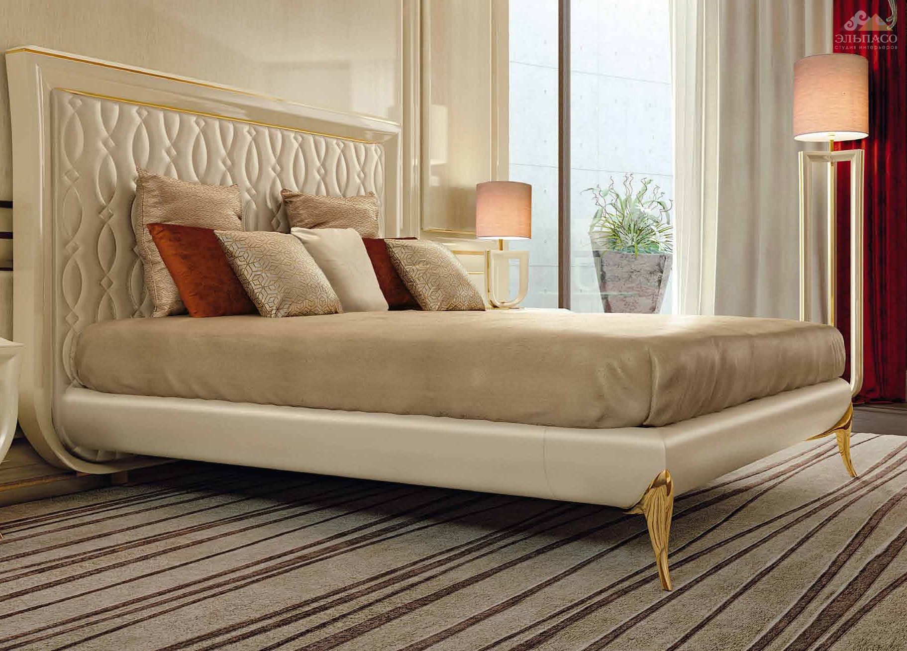 Роскошная кровать с изголовьем. Декорирована перламутровой кожей. Лакировка цвета капучино с декором ригатино, с глянцевым покрытием со вставками и ножками из позолоченной латуни.