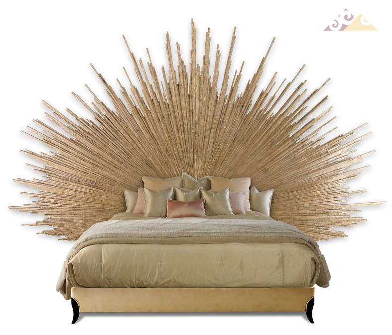 Высота:217 смЯркая и стильная модель кровати. Уникальное изголовье выполнено в виде лучей солнца. Применяется техника резьбы по дереву, бронзо - золотистое покрытие инсталляции. Модель обтянута мягким текстилем и кожей набук по периметру основания. Ножки изготовлены из красного дерева махагон. Полированные и покрытые лаком поверхности.