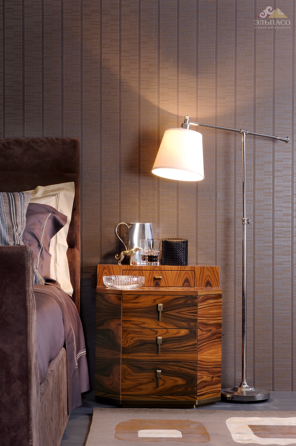 Прикроватная тумбочка фигурной формы с 4 выдвижными ящиками. Выполнена из натуральной древесины на металлическом основании. Цена указана на тумбочку в отделке палисандр (palisander). Возможны различные варианты отделки.