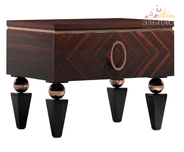 Прикроватная тумбочка из массива дерева твердых пород в матовой эбеновой отделке с одним выдвижным ящиком. Ножки из черного лакированного дерева с декором в виде четырех стальных сфер в отделке медь.