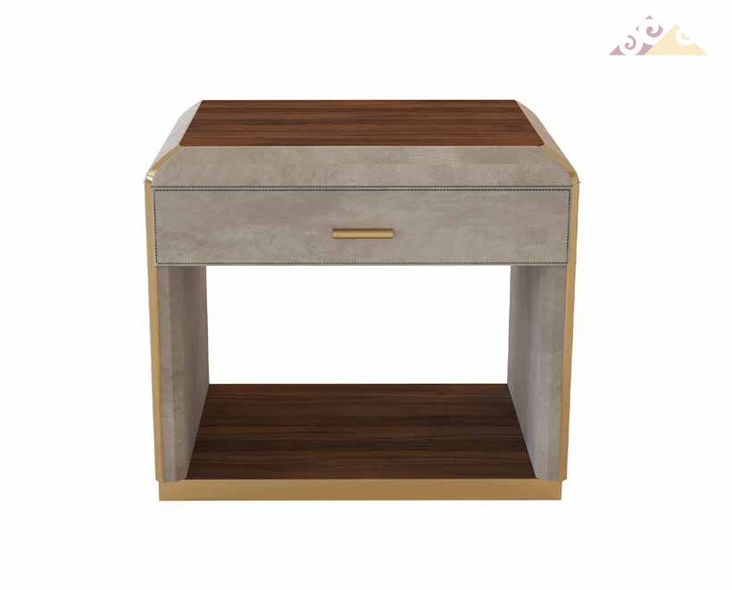 Прикроватная тумбочка из массива дерева твердых пород в матовой отделке венге с одним выдвижным ящиком, оснащенным системой "push-pull" и ножками из стали в отделке латунь.