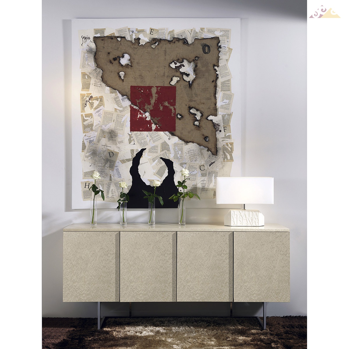 Стильный высокий буфет для современных интерьеров Каркас модели изготовлен из дерева, фасады в отделке ERABLE (кленовый шпон, блестящий лак). Возможны другие варианты отделки согласно каталогу производителя.