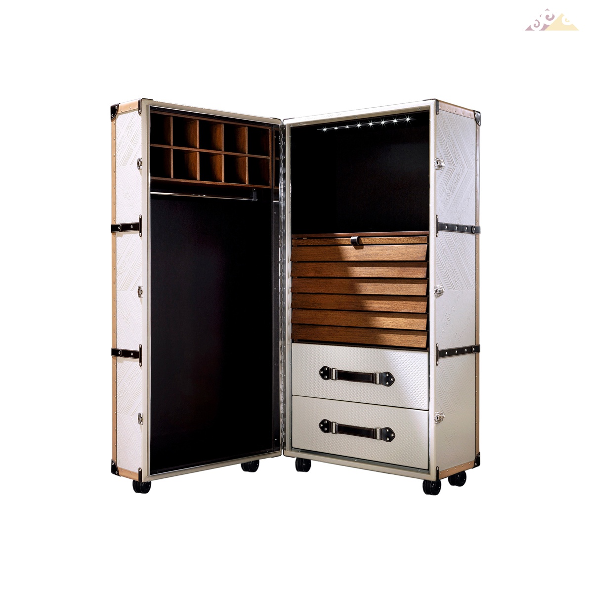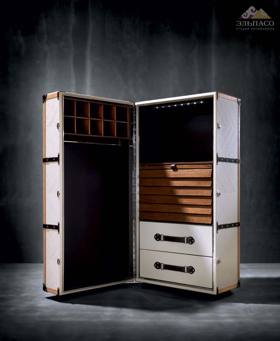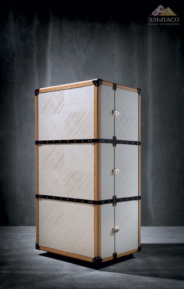 Экстравагантный бар в виде чемодана-шкафа в кожаной отделке. Каркас модели изготовлен из дерева, обтянут кожей L0001. Внутренняя отделка: DECO WALNUT (тёмный орех). Идеальный вариант безукоризненно выполненной дизайнерской мебели.