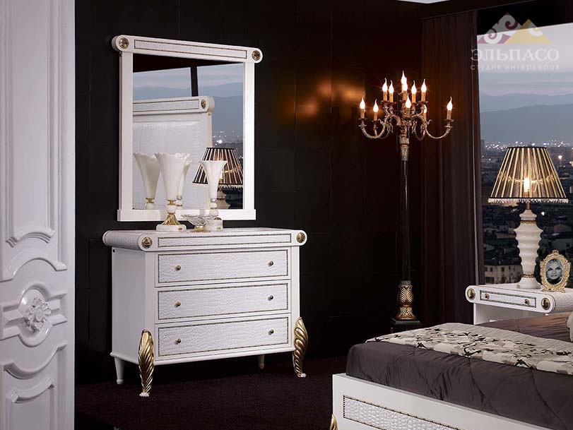 Роскошный комод Soher Аrt.4039 с тремя выдвижными ящиками. Каркас модели изготовлен из массива древесины. Поверхности полированные, отделаны блестящим белым лаком. Применена ручная обработка материала. Столешница и фасады ящиков обтянуты плотной кожей из ассортимента фабрики. Корпус украшен литыми бронзовыми и резными деталями, покрытыми фольгой из полированного золота. Красота, роскошь и практичность на каждый день.