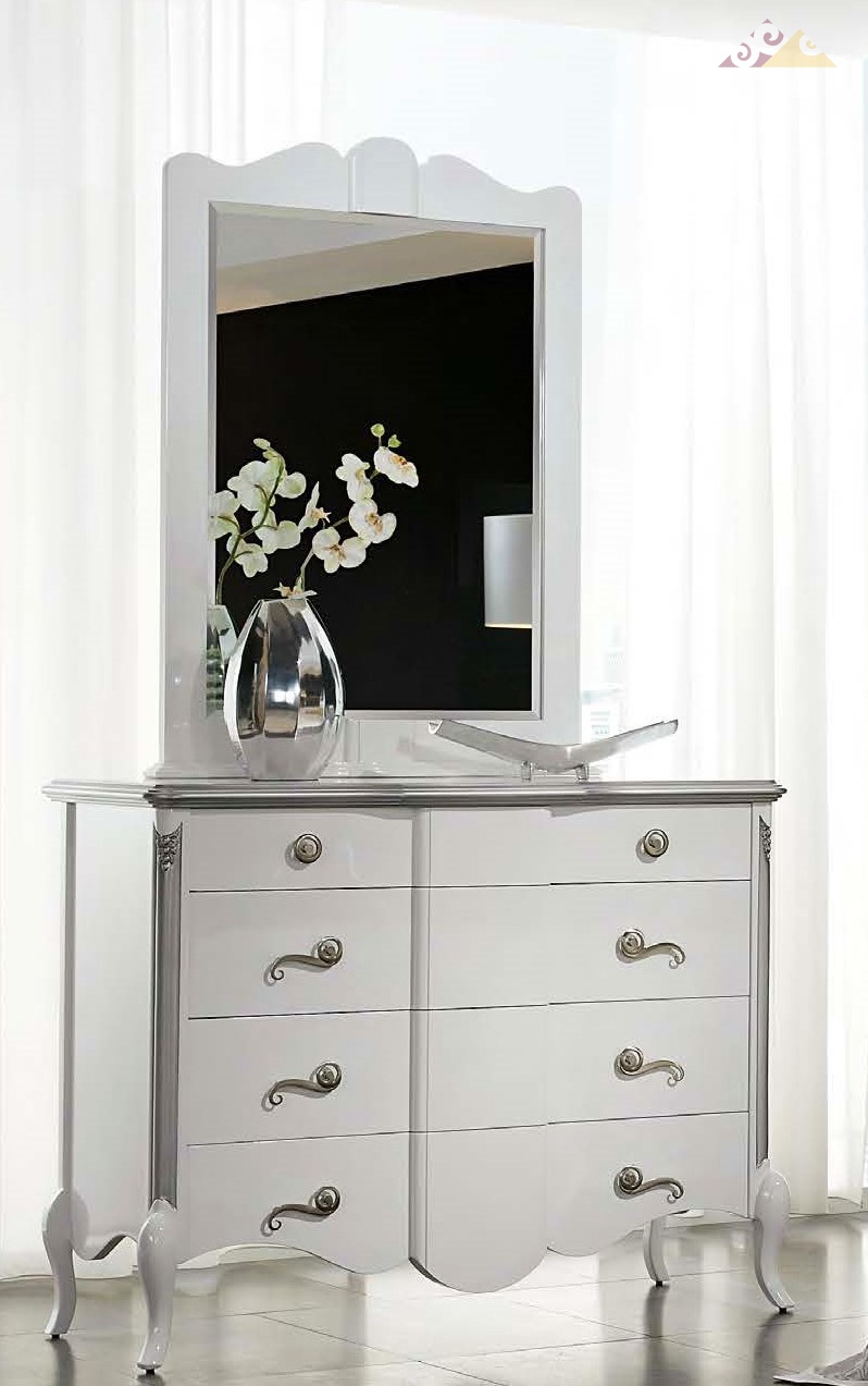 Комплект мебели для спальни состоит из стильного комода и элегантного зеркала. Компоненты комплекта выполнены из натурального дерева и шпона американской вишни, покрытого белоснежным блестящим лаком. Элементы декора отделаны серебристым лаком. Данный тип отделки увеличивает цену комплекта на 5%.