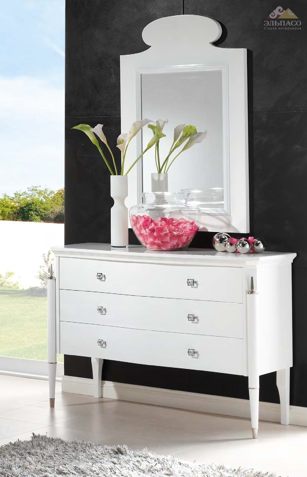 Комплект мебели для спальни состоит из стильного комода, с выдвижными ящиками, и изящного зеркала, расположенного над ним. Компоненты комплекта выполнены из натурального шпона американского ореха покрытого блестящим белым лаком. Поверхности полированные, глянцевые. Ножки с наконечниками из нержавеющей стали.