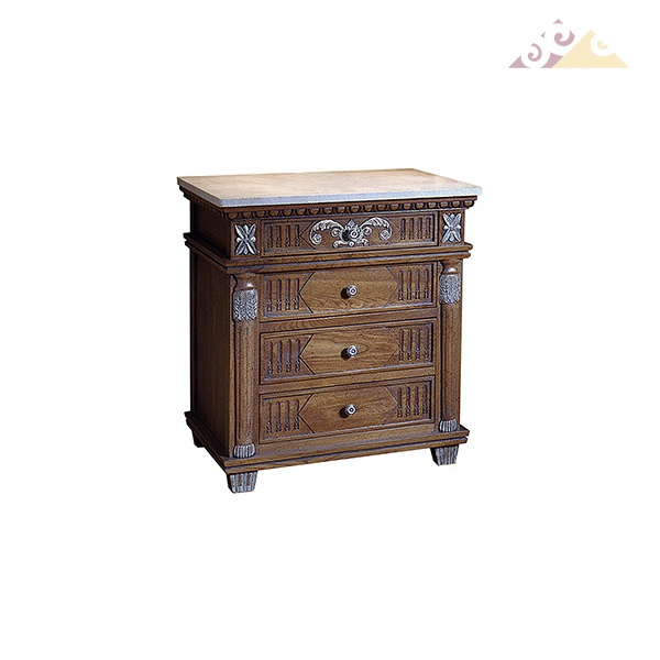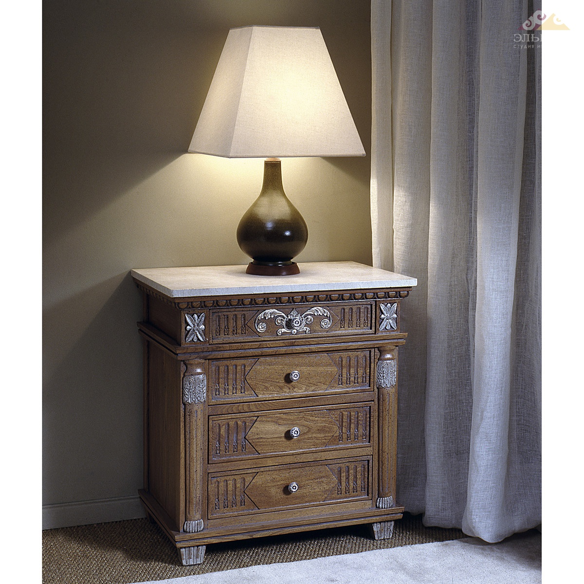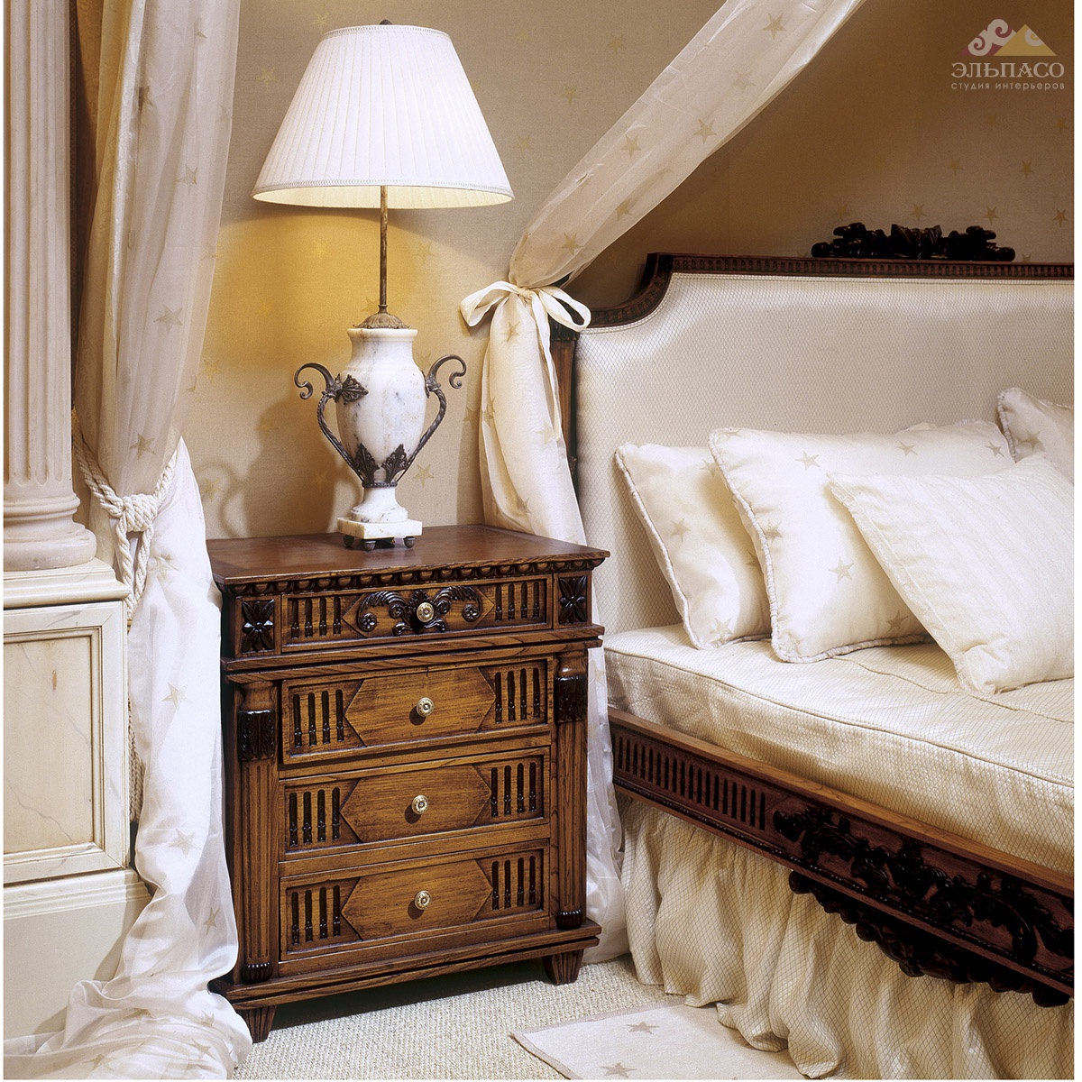 Прикроватная тумбочка с 4-мя выдвижными ящиками. Модель выполнена из массива древесины в отделке орех. Декорирована резьбой с цветочными мотивами и фурнитурой в бронзе. Столешница обтянута кожей. Изделие представляет собой идеальный вариант безукоризненно выполненной дизайнерской мебели.