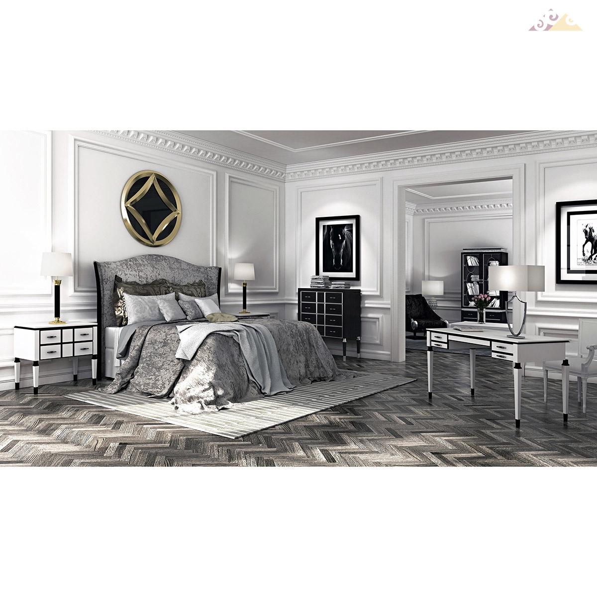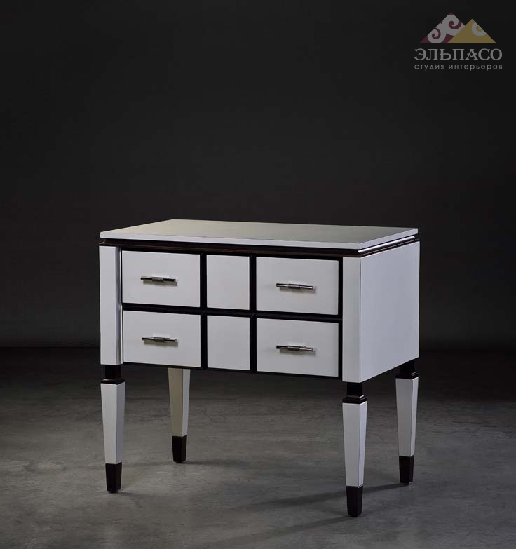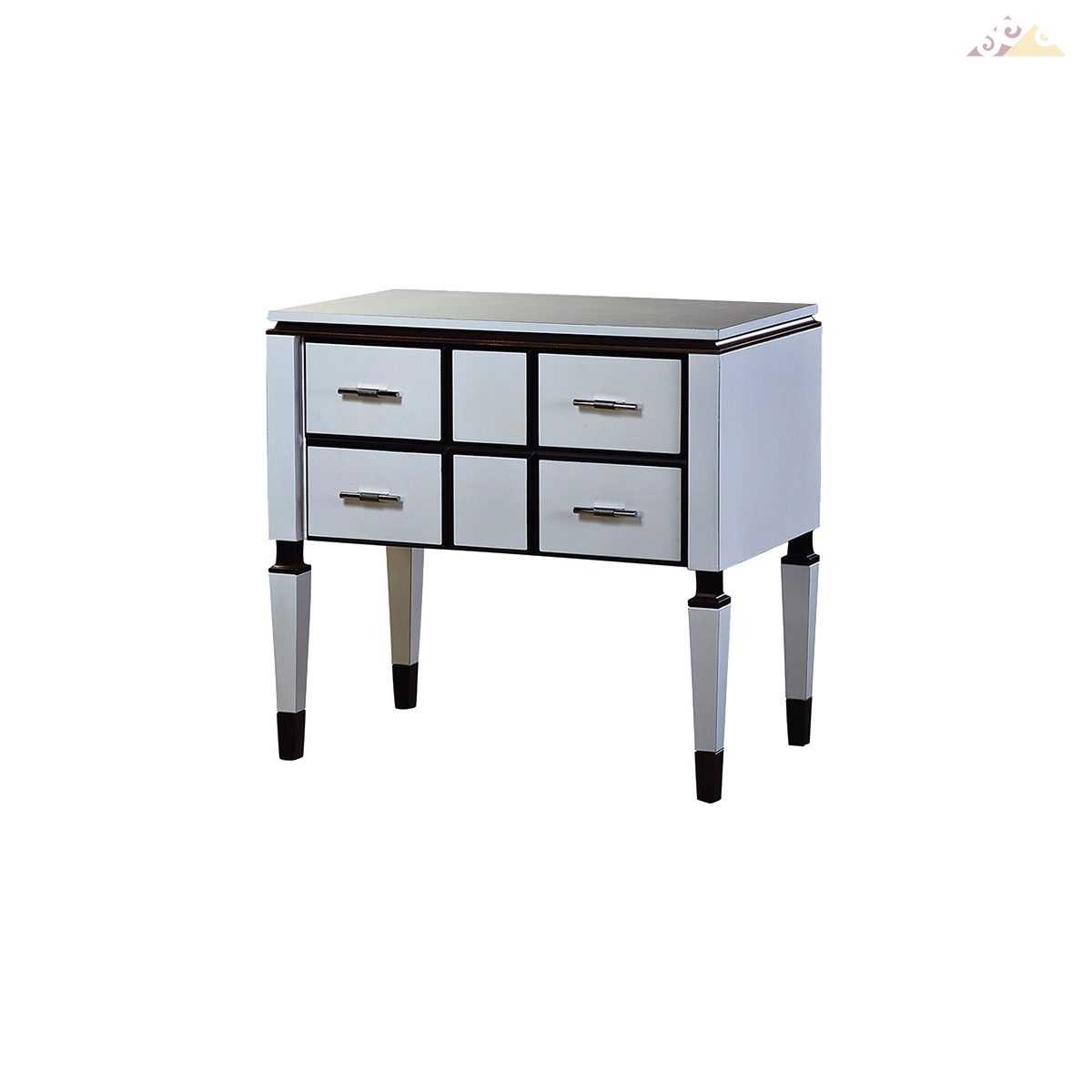 Стильная прикроватная тумбочка с двумя выдвижными ящиками. Модель выполнена из массива дерева, тонированного в белый цвет, элементы - в черный. Преобразит и облагородит любой интерьер. Цветовая палитра согласно каталогу компании.