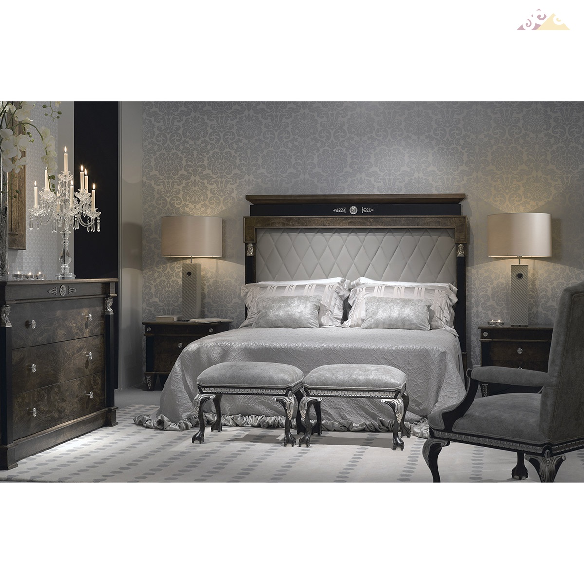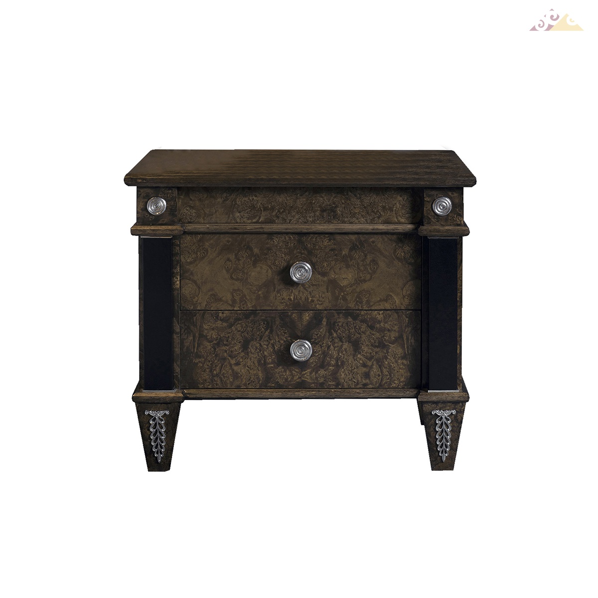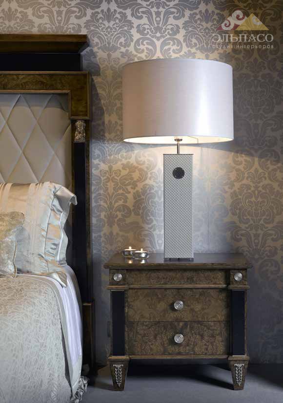 Прикроватная тумбочка с двумя выдвижными ящиками. Модель выполнена из массива древесины в отделке орех. Тумбочка декорирована резными элементами ручной работы в серебре и в коже. Представляет собой идеальный вариант безукоризненно выполненной дизайнерской мебели.