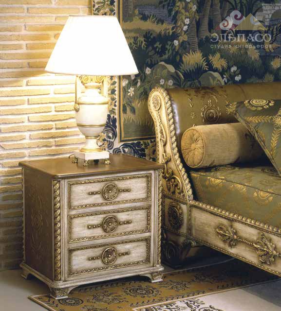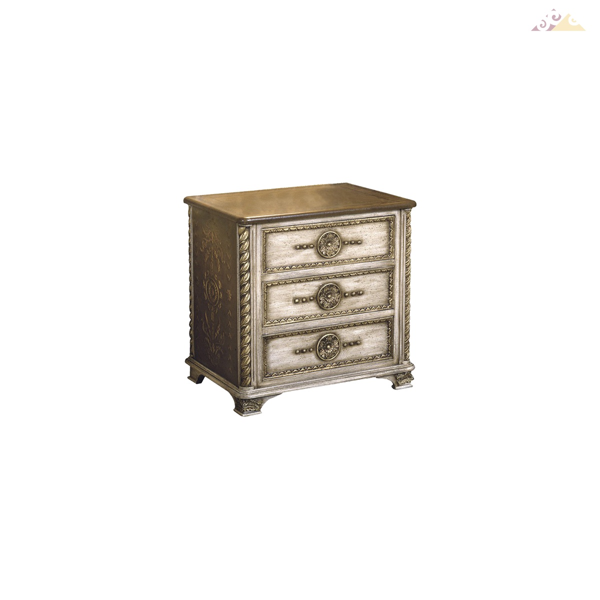 Прикроватная тумбочка с тремя выдвижными ящиками. Модель выполнена из массива древесины и украшена резьбой ручной работы в золоте. Столешница обтянута кожей REIMS. Преобразит и облагородит любой интерьер. Цветовая палитра согласно каталогу компании.