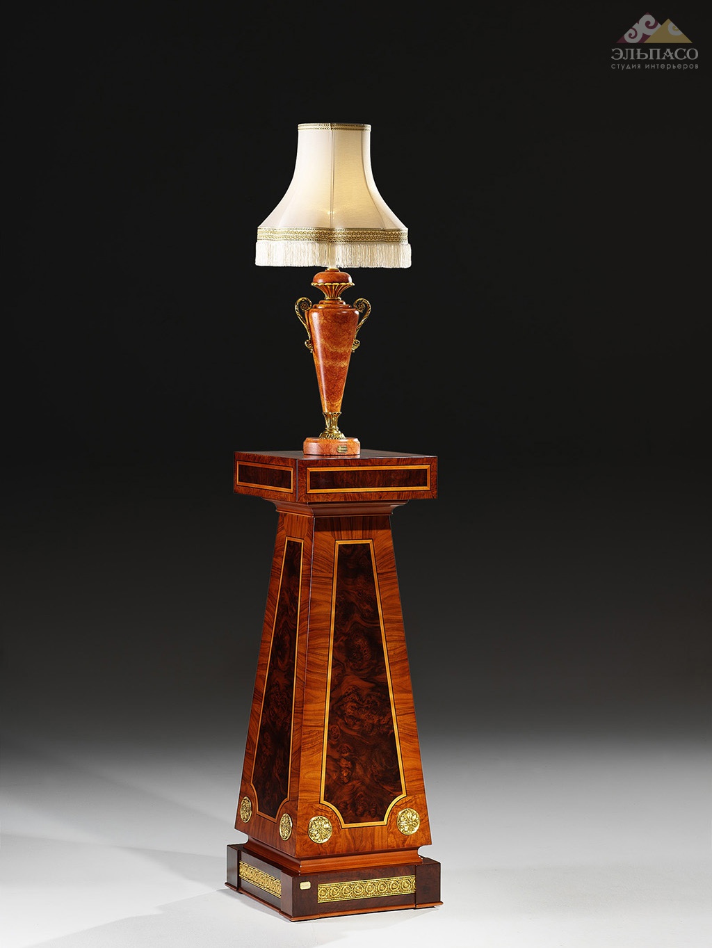 Роскошная подставка Soher Аrt.3832 в форме пьедестала. Каркас модели изготовлен из массива древесины, покрытого натуральным шпоном ореха разных сортов. Поверхности полированные, отделаны прозрачным лаком. Применена ручная обработка материала. Корпус декорирован литыми и резными узорами, покрытыми фольгой из французского золота. Уникальность, красота, величие.