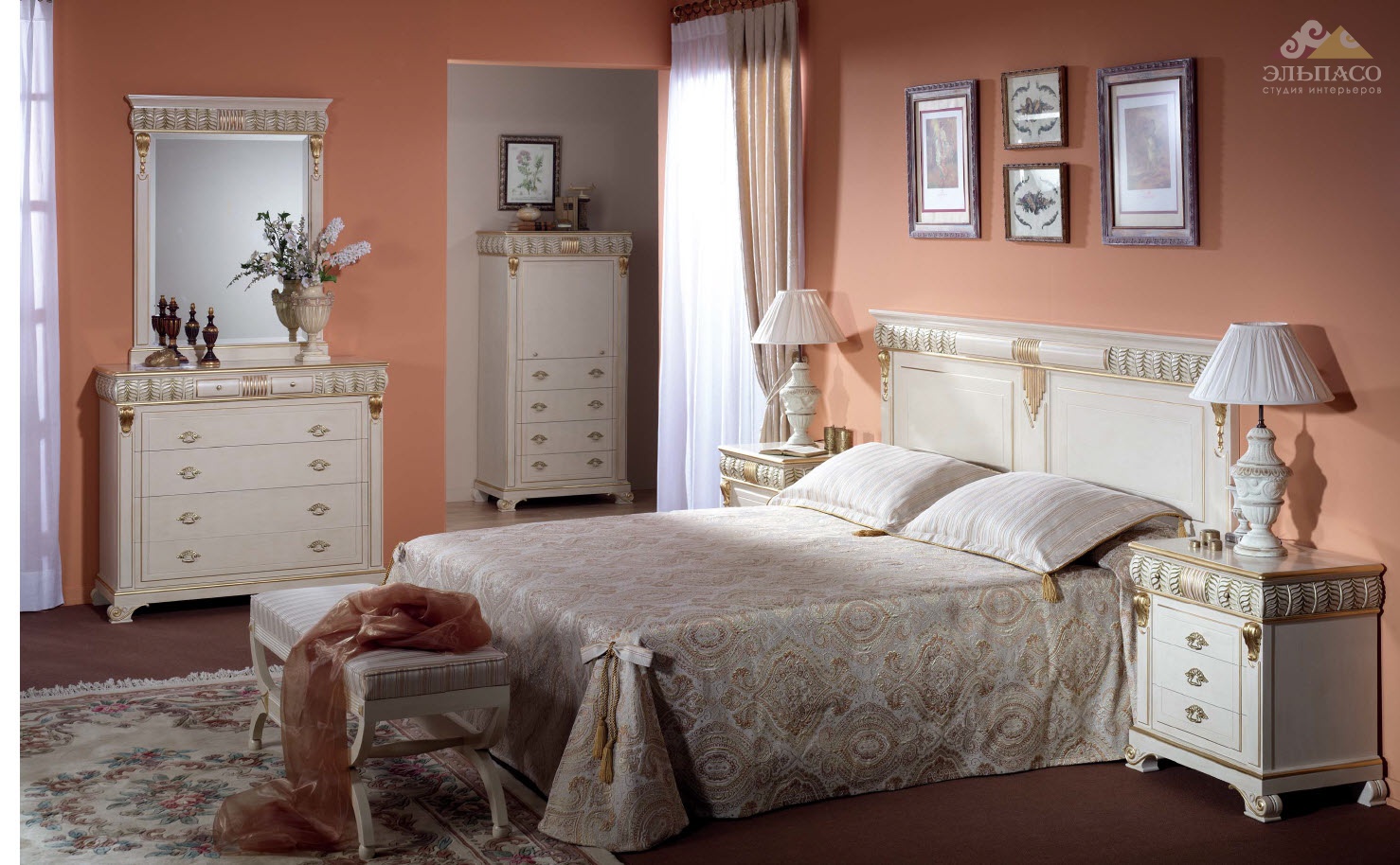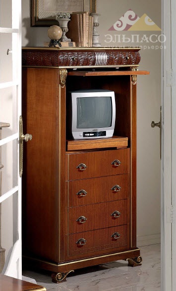 Высокий комод с 4 выдвижными ящиками гармонично впишется в элегантную спальню классического стиля. Шифоньер белого цвета, отделка - Rozado Antic, детали декорированы золотом Oro.