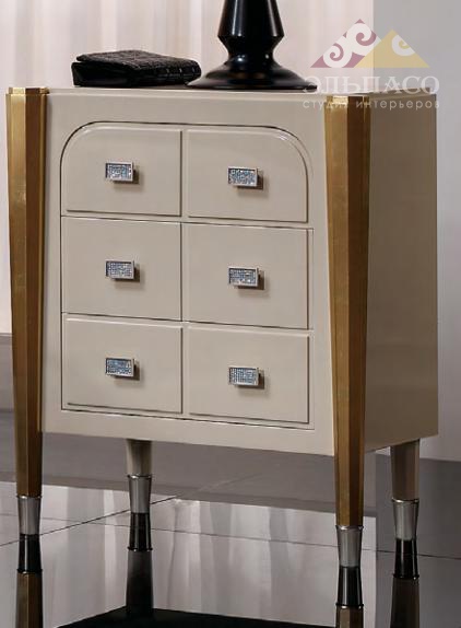 Роскошный шкаф с распашными дверцами и выдвижными ящиками. Фасад декорирован фигурными узорами. Модель выполнена из натурального дерева и шпона американской вишни, отделка корпуса - орех и вишня. Поверхности полированные, глянцевые. Отделка пилястров в античном черном.