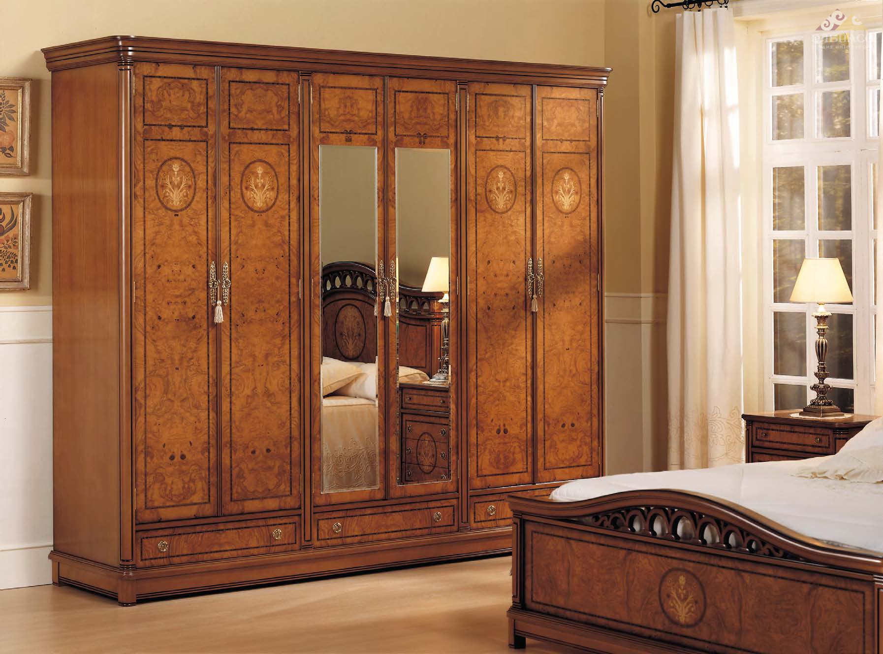 Большой шкаф, состоящий из трех отделений и трех выдвижных ящиков. Модель выполнена в натуральном шпоне ясеня, с маркетри из сикомора, самшита, ореха и палисандра. Двери центрального отделения зеркальные.
