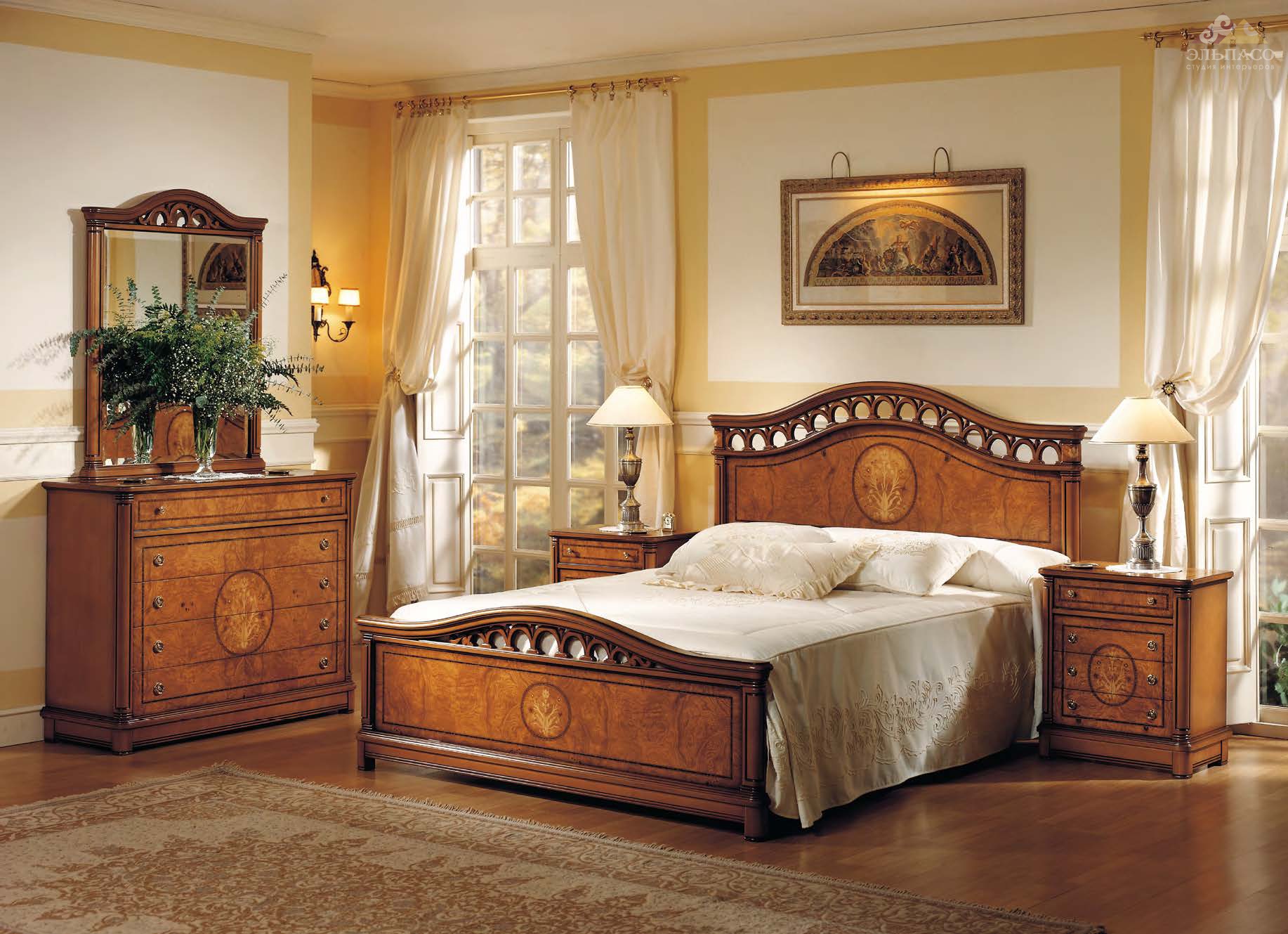 Комплект мебели для спальни состоит из двуспальной кровати, двух прикроватных тумбочек, элегантного комода и, расположенного над ним, зеркала. Компоненты комплекта выполнены в натуральном шпоне ясеня, с маркетри из сикомора, самшита, ореха и палисандра. Поверхности полированные, глянцевые в отделке Olivato.