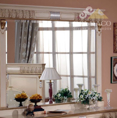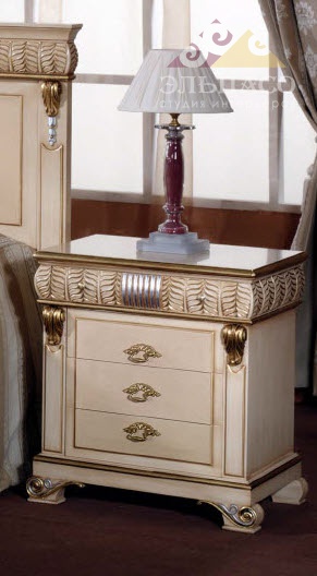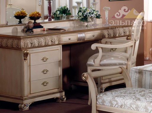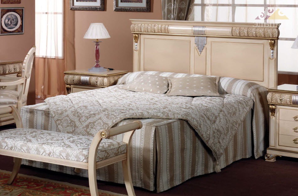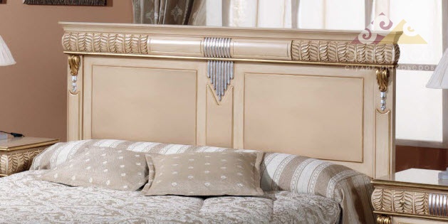 Роскошная спальня в отделке бежевым лаком Arena. Все предметы спальни декорированы красивым резным узором и золотыми элементами в едином стиле. (В цену комплекта не входит цена кресла.)