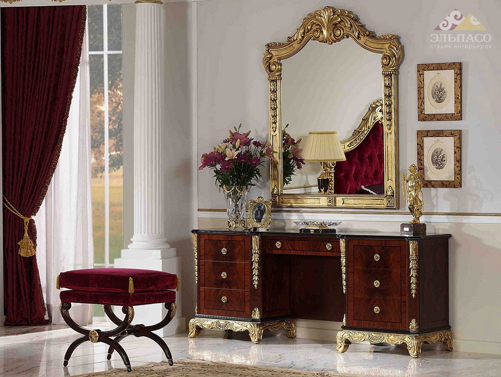 Презентабельный туалетный столик Soher Аrt.3895 с выдвижными ящиками. Каркас модели изготовлен из массива древесины, покрытого натуральным шпоном красного дерева. Поверхности полированные, отделаны прозрачным лаком. Применена ручная обработка материала. Корпус декорирован литыми бронзовыми и резными узорами, покрытыми фольгой из французского золота. Функциональность, стиль и ежедневная практичность.