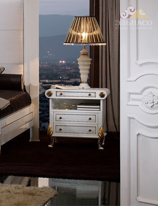 Элегантная прикроватная тумбочка Soher Аrt.4040 с тремя выдвижными ящиками и полочкой. Каркас модели изготовлен из массива древесины. Поверхности полированные, отделаны блестящим белым лаком. Применена ручная обработка материала. Столешница и фасады ящиков обтянуты плотной кожей из ассортимента фабрики. Корпус украшен литыми бронзовыми и резными деталями, покрытыми фольгой из полированного золота. Функциональность, стиль и ежедневная практичность.