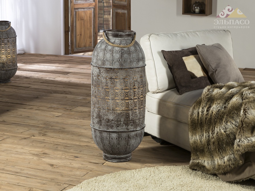 Высота:98 смФонарь Schuller Kayla Art. 442637 с 1 лампой, из чеканного металла, ручка из плетёной верёвки, покрытие в стиле рустик серого цвета под старину.