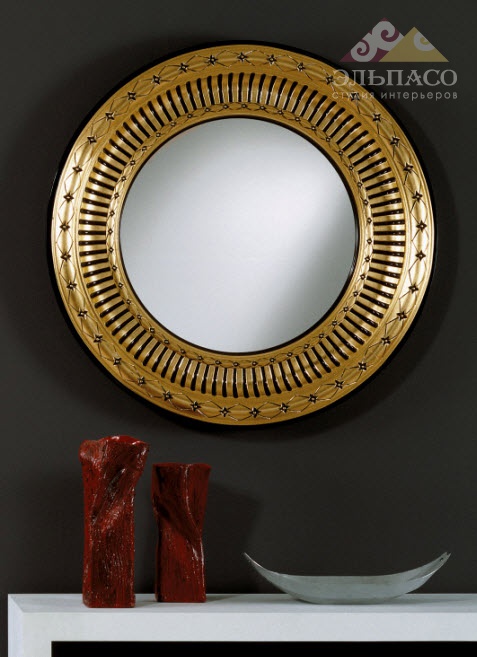 Стильное зеркало круглой формы из уникальной коллекции Art deco. Корпус декорирован резьбой по дереву ручной работы. Возможны варианты исполнения рамы в черной, белой либо цвета слоновой кости гамме с различными комбинациями отделки серебряной и золотой фольгой.