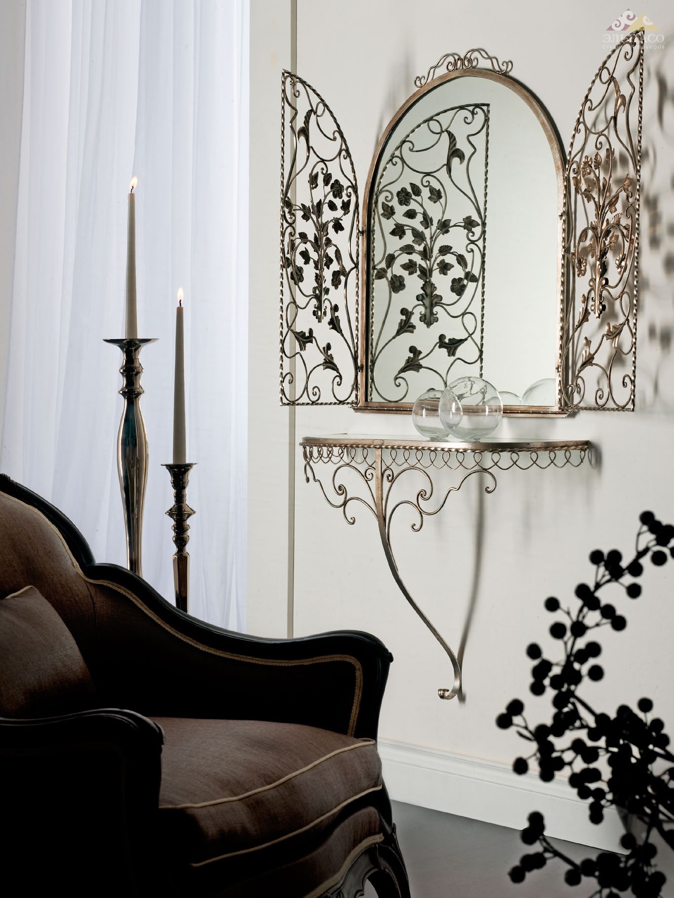 Зеркало в раме и с декором в виде фигурных ставен, декорированных цветочными элементами из стали ручной ковки цвета черненного серебра. Элегантность и роскошь.