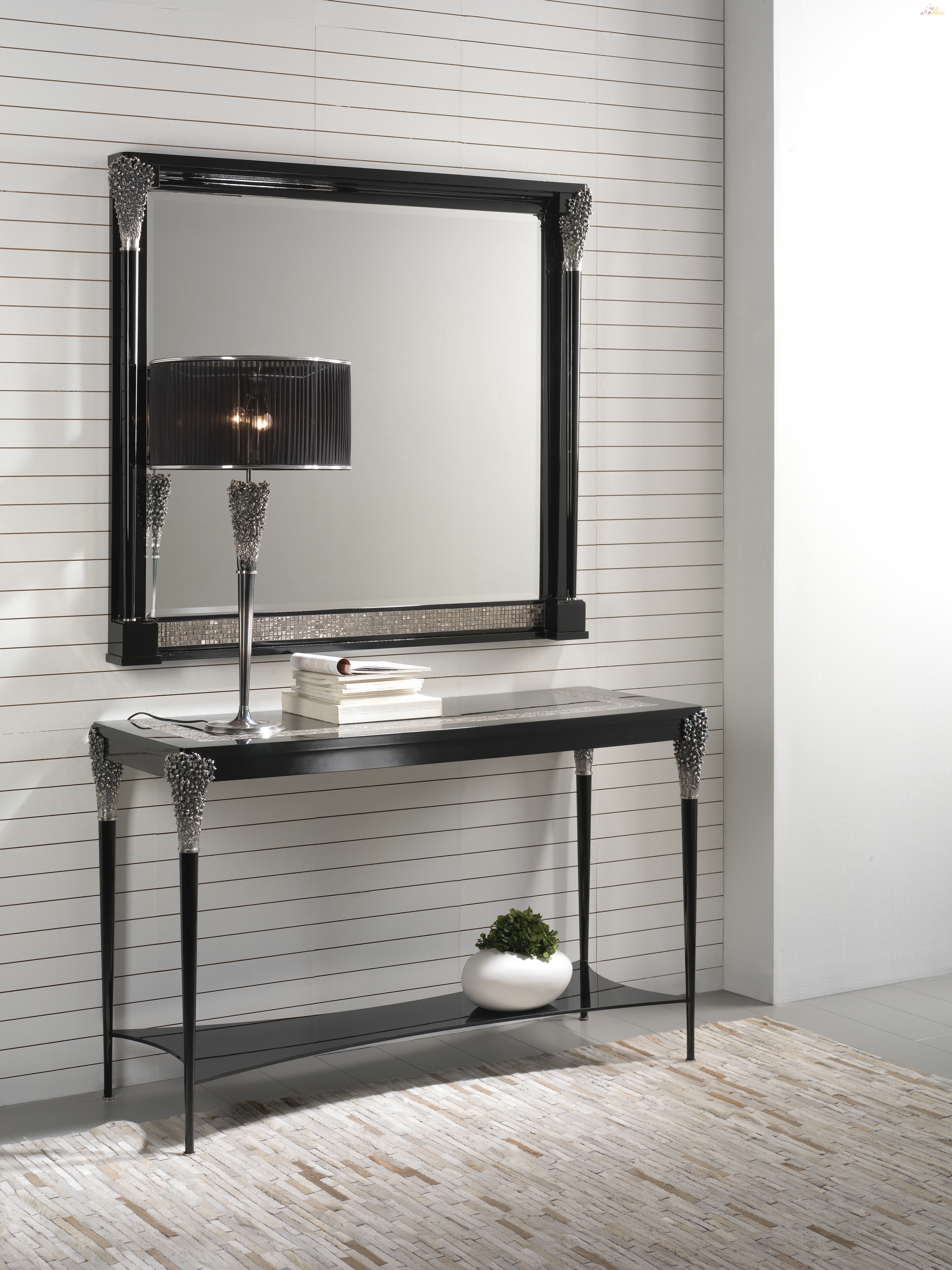 Элегантное зеркало Mariner Аrt.50013_1 прямоугольной формы. Каркас модели изготовлен из массива древесины покрытой натуральным шпоном. Поверхности полированы вручную, отделаны черным лаком. Корпус украшен литыми бронзовыми деталями, покрытыми тонким слоем серебра. Низ рамы декорирован мозаикой из муранского стекла. Исключительность, стиль, престиж.