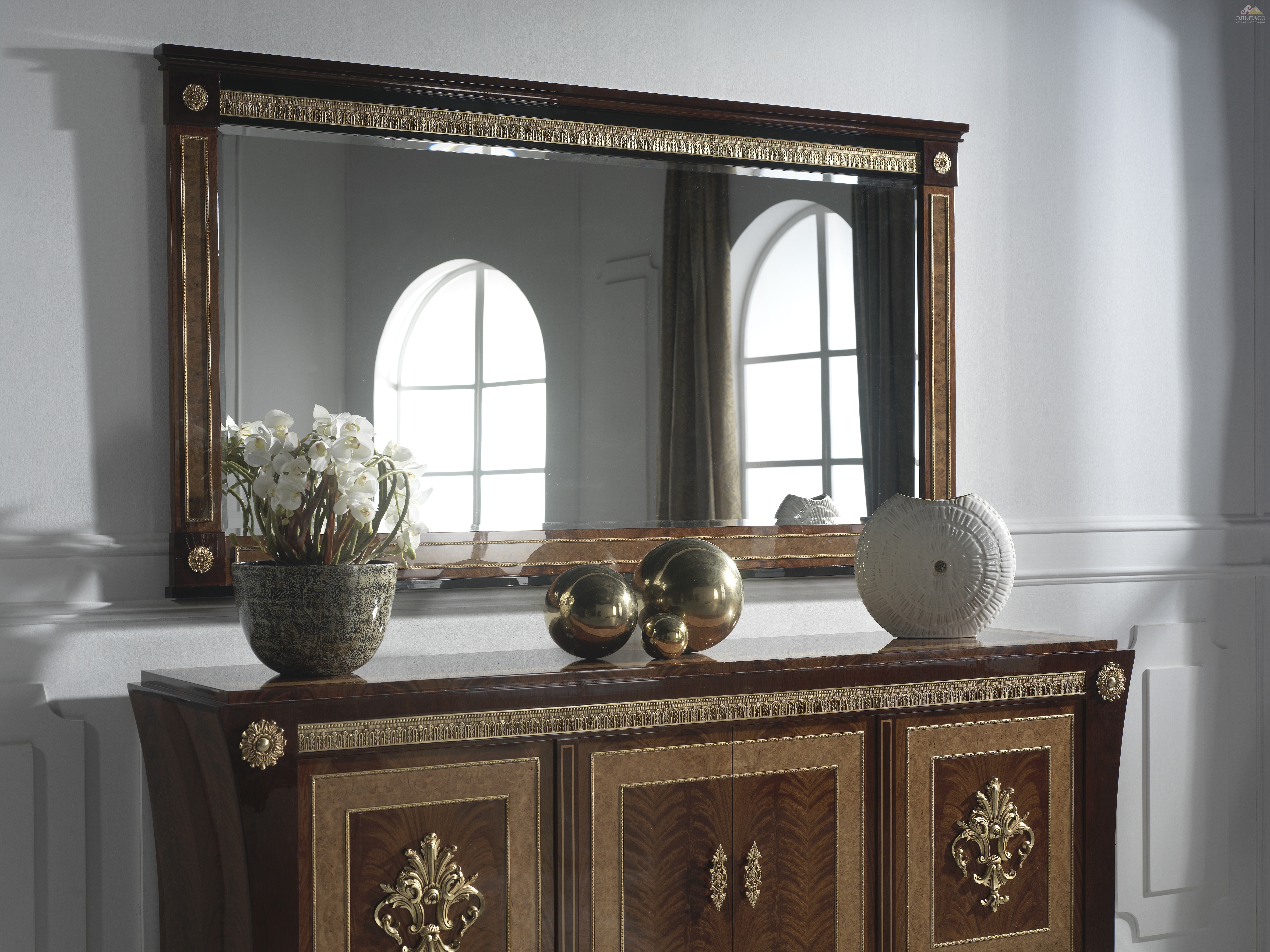 Большое зеркало Mariner Аrt.50070 прямоугольной формы с карнизом. Каркас модели изготовлен из массива древесины, покрытого натуральным шпоном английского красного дерева и дуба. Поверхности полированы вручную, отделаны прозрачным лаком. Рама декорирована литыми латунными узорами, покрытыми французским золотом. Уникальность, красота, величие.